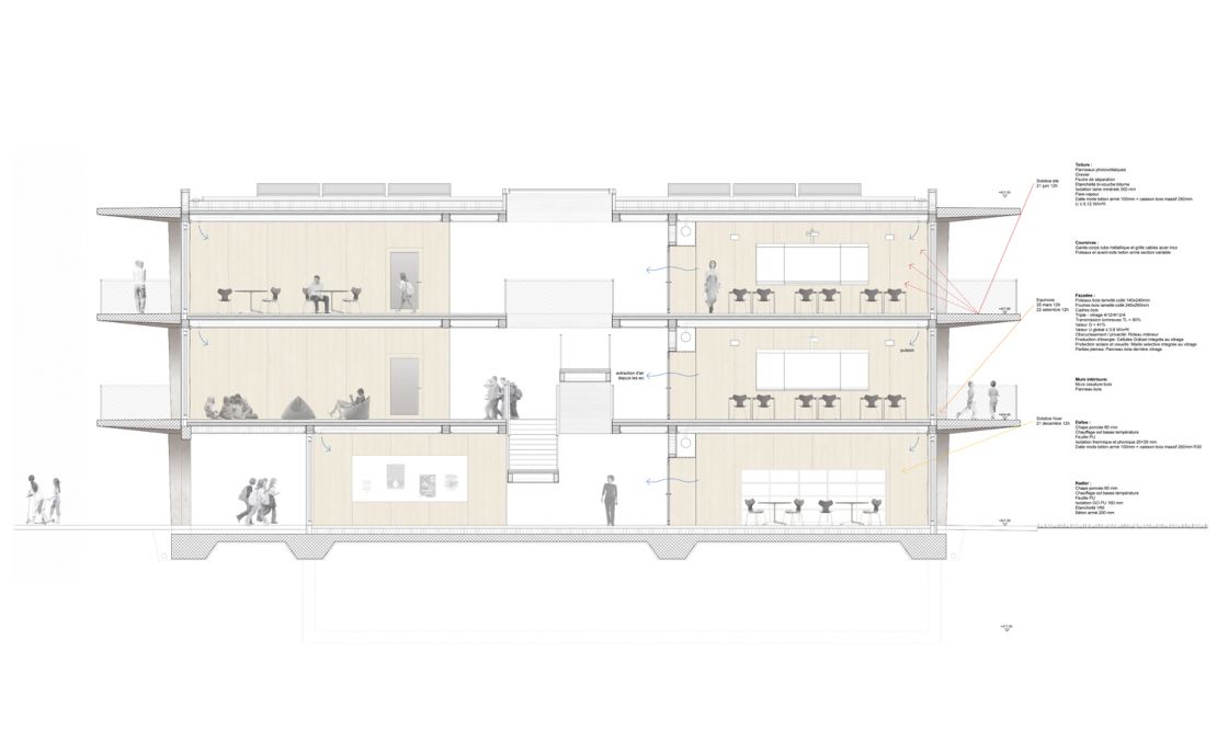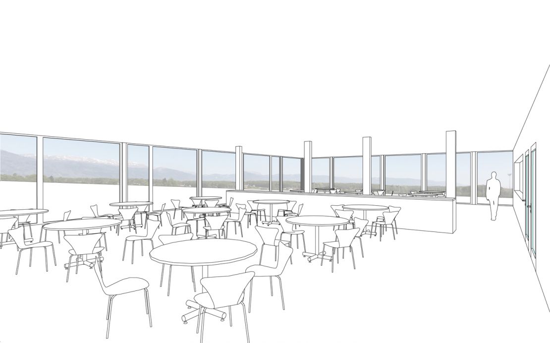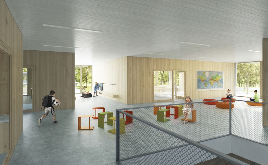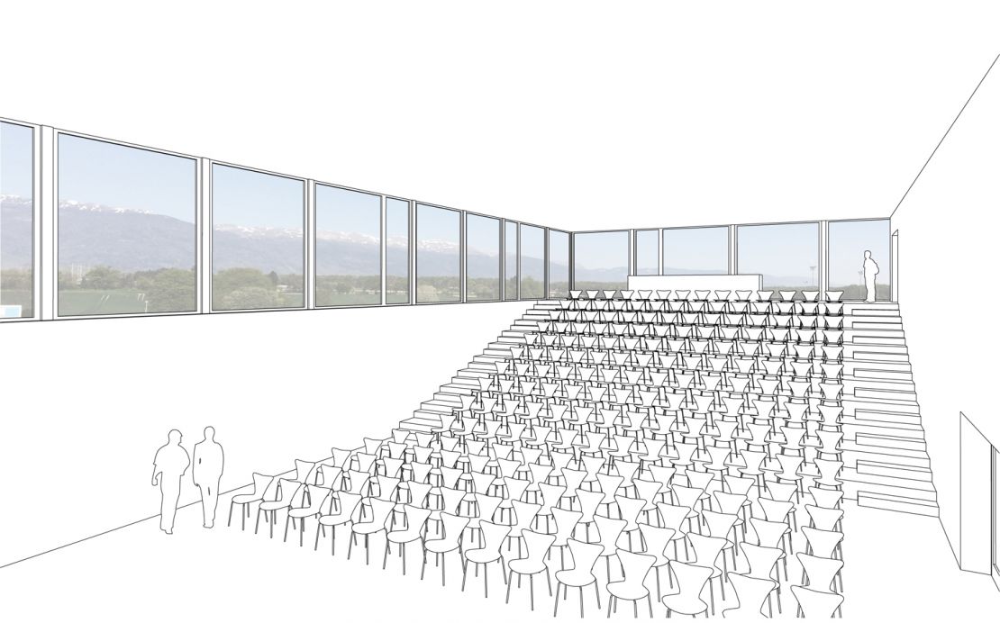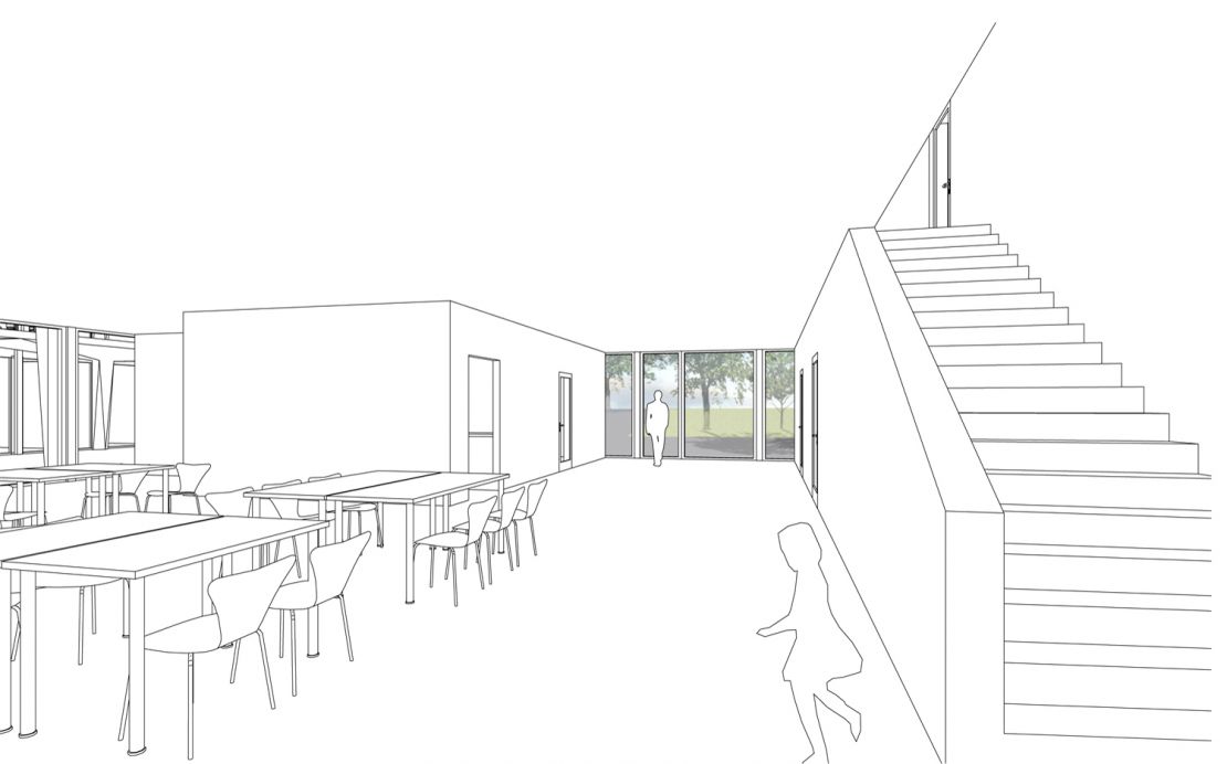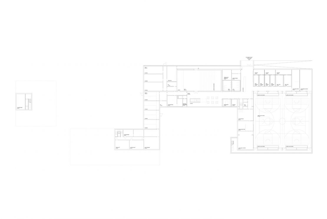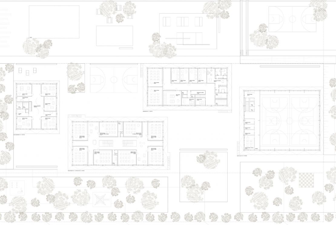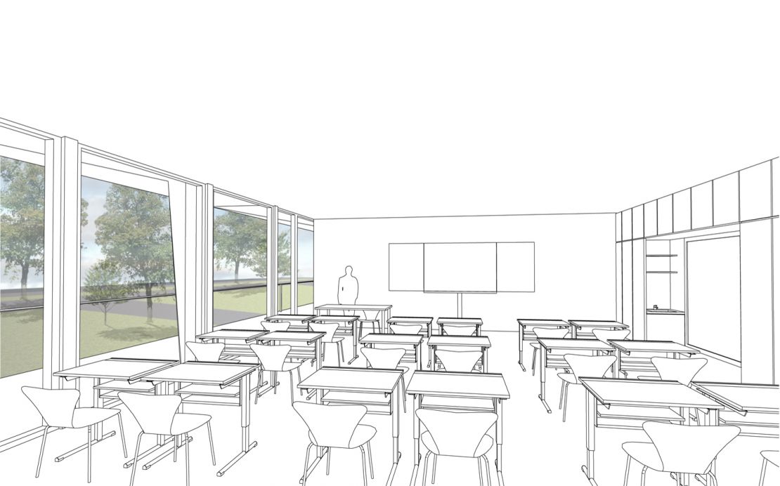 Le rez-de-chaussée et le sous-sol habritent les accès principaux et les espaces dédiés aux publics divers qui fréquentent la salle de sport, le restaurant, l'aula, les salles spécialisées et les espaces de réunions. Les salles de classes et les locaux scolaires se situent aux étages supérieurs. Tous les espaces bénéficient d'un généreux éclairage naturel et se prolongent par des espaces extérieurs. Tous jouissent de vues sur le paysage.