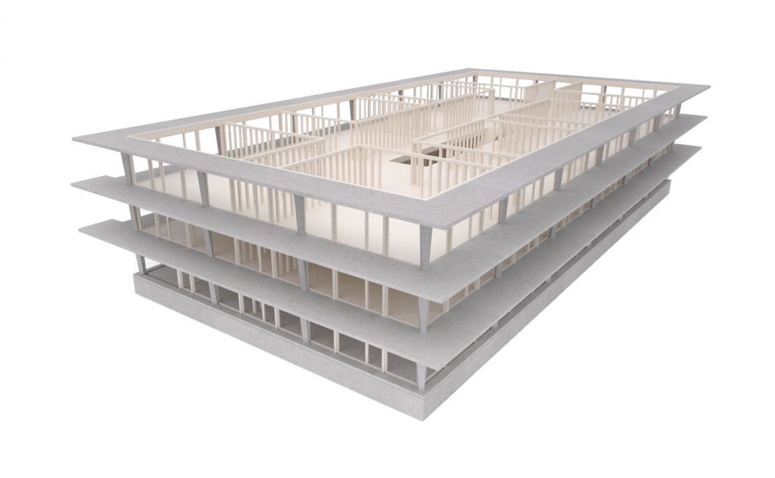 La structure des constructions combine les qualités du béton et du bois. A l'intérieur, une charpente en bois partitionne les espaces. En façade, des portiques en béton armé forment une ossature durable qui remplit plusieurs fonctions. Tout en jouant le rôle de coursives et de voies d'évacuation, les avant-toits protègent les fenêtres, permettent de se passer de stores extérieurs et autorisent une relation plus libre et plus forte avec le paysage. En renforçant la stabilité des bâtiments, cette structure périphérique libère les espaces intérieurs, qui offrent de très nombreuses possibilités d'aménagement.
