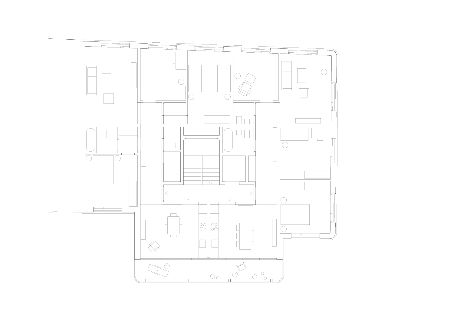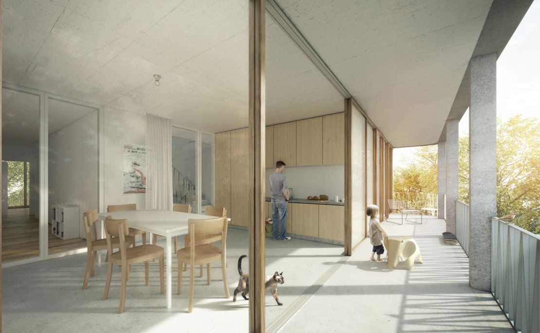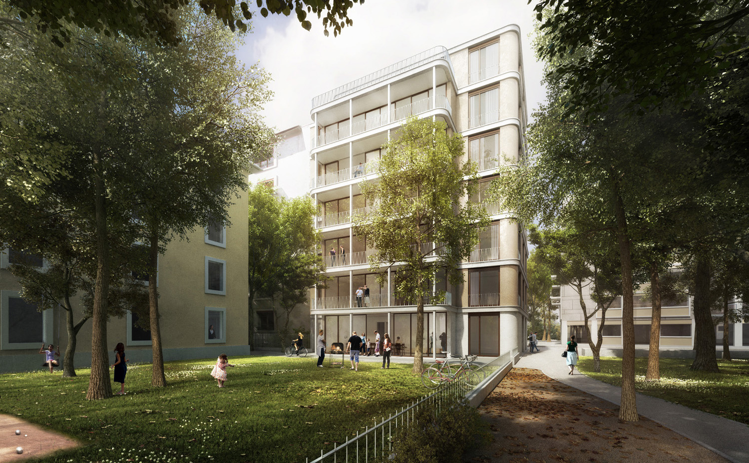 Le projet préserve la cour-jardin et protège l'intimité des habitants. Distribués par une cage d'escalier centrale, les logements sont traversants. Ils comprennent des appartemements de 3 à 6 pièces, ainsi qu'un cluster communautaire de 8 pièces. Les chambres sont disposées de chaque côté, tandis que les séjours sont tournés sur la rue, vers le soleil couchant.
