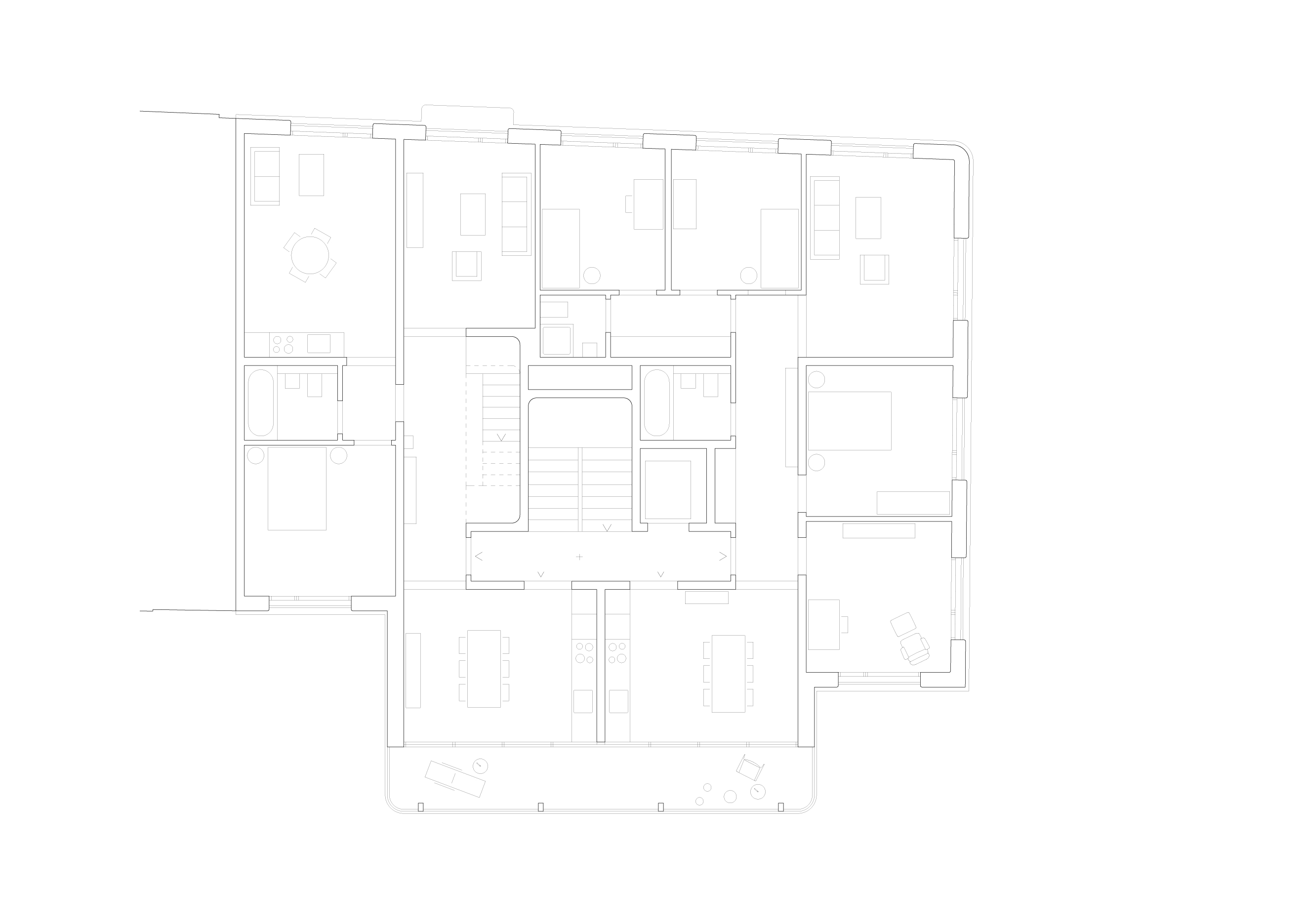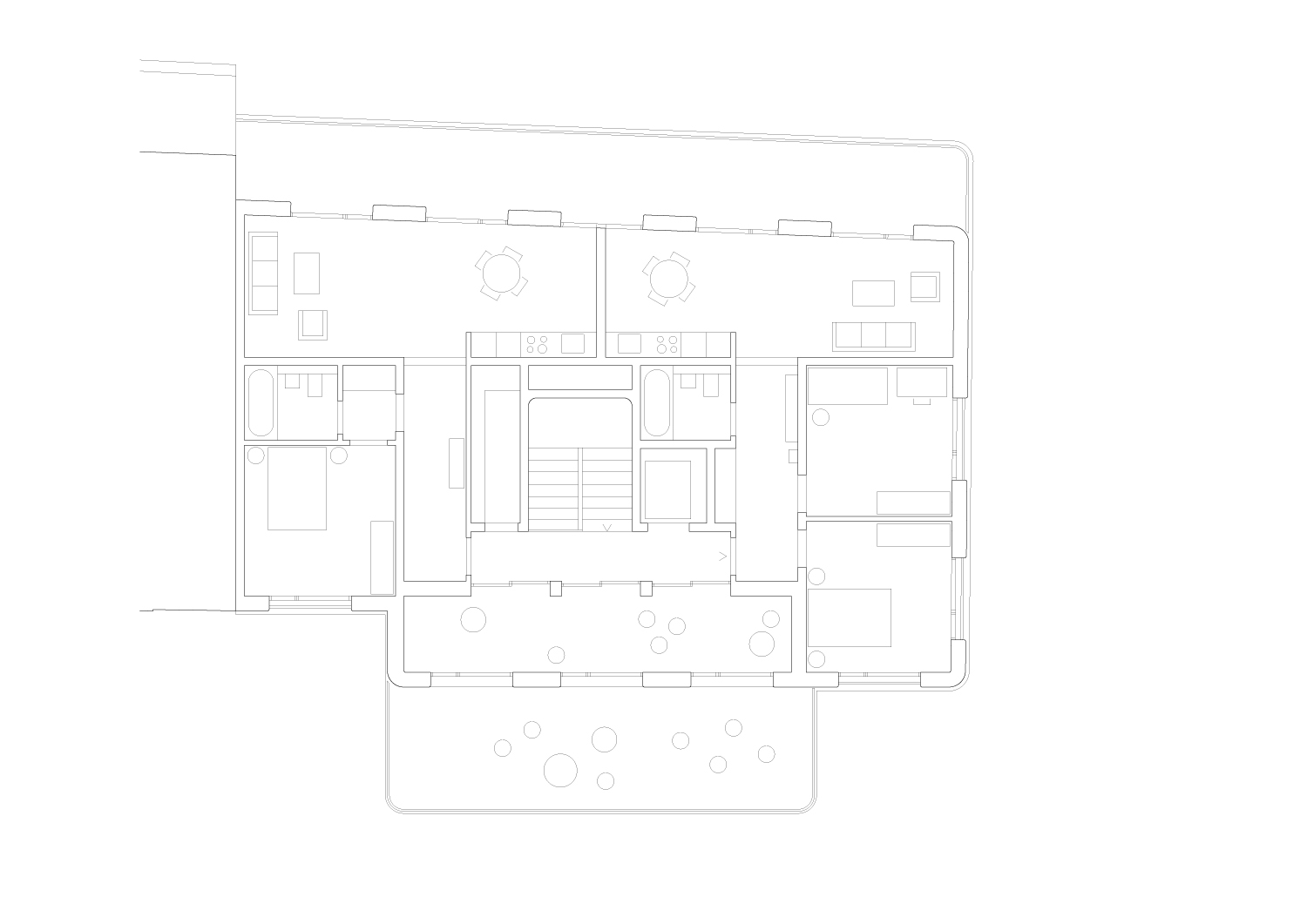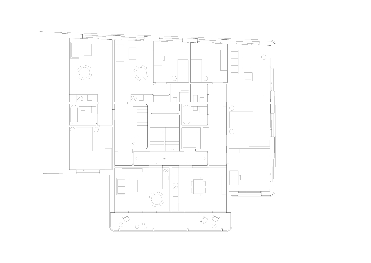 Le projet préserve la cour-jardin et protège l'intimité des habitants. Distribués par une cage d'escalier centrale, les logements sont traversants. Ils comprennent des appartemements de 3 à 6 pièces, ainsi qu'un cluster communautaire de 8 pièces. Les chambres sont disposées de chaque côté, tandis que les séjours sont tournés sur la rue, vers le soleil couchant.