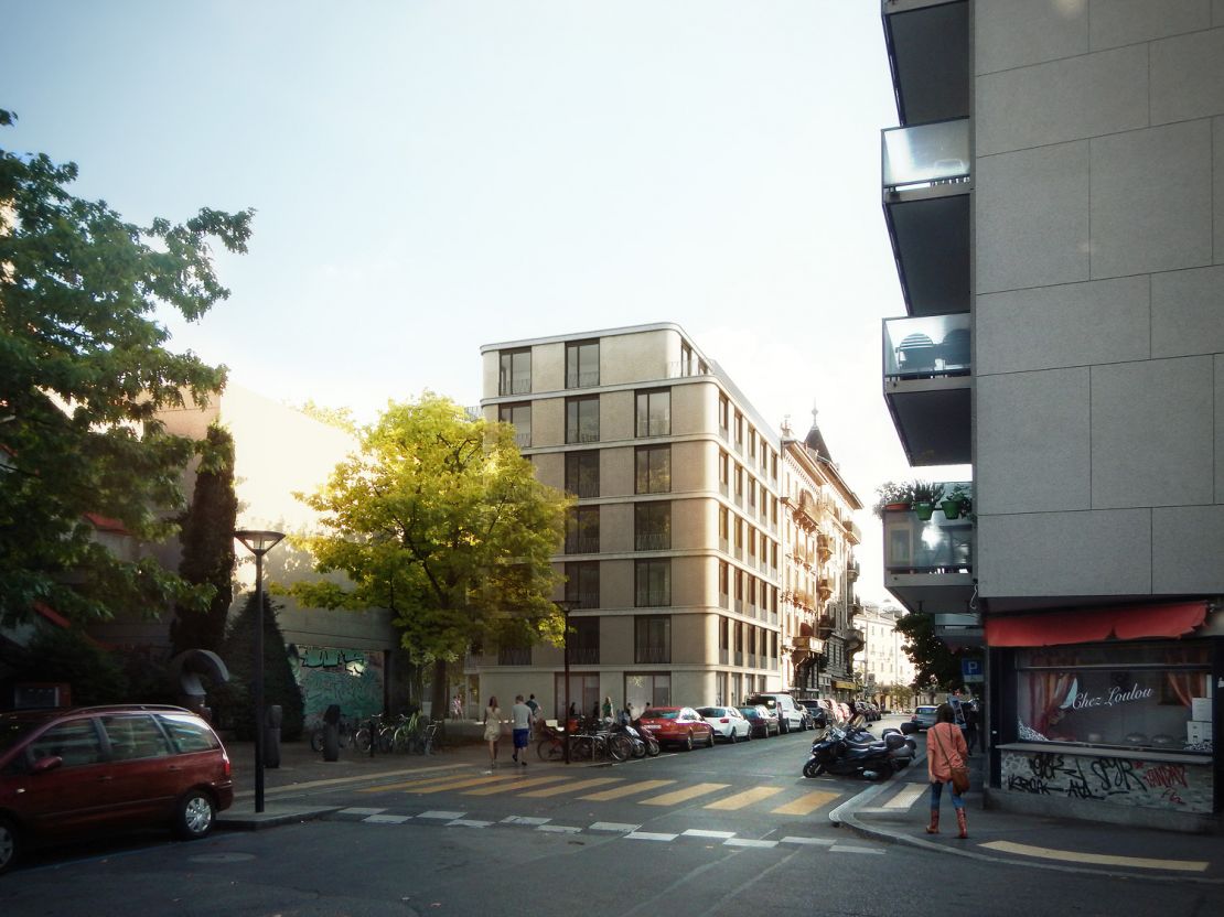 Le site de cette construction se trouve en limite nord-ouest du quartier des Grottes, sur la rive droite de la ville de Genève. Le bâtiment se place dans le prolongement d'un front de rue défini par deux anciens immeubles locatifs de cinq étages avec combles. Au centre de la parcelle s'élève encore un pavillon de logements.