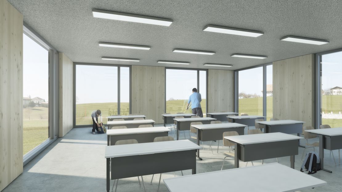Situé à l'angle d'une zone résidentielle, en bordure de terrains agricoles, ce pavillon scolaire redessine la limite du village fribourgeois. Son implantation définit un espace public bien délimité, propice à la création d'un aménagement paysager.