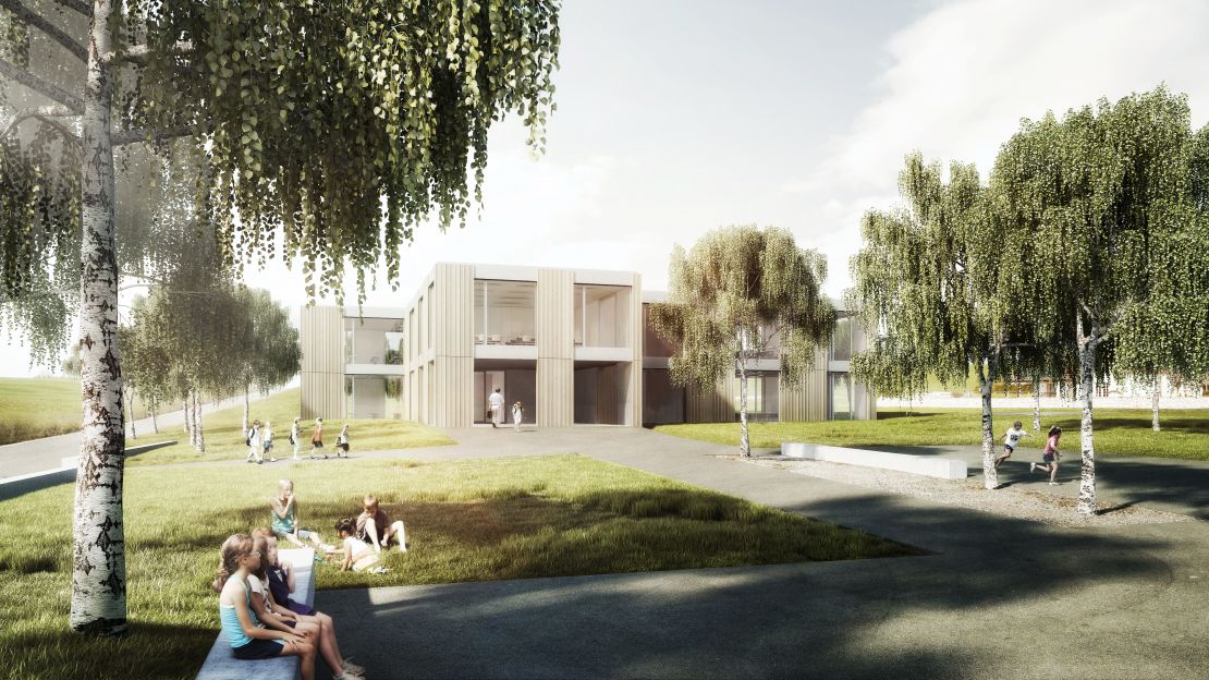 Le volume du bâtiment comprend deux niveaux sans sous-sol. Les salles de classes sont disposées aux deux bouts d'un couloir central en forme de "S" qui inclut la cage d'escalier et les sanitaires. Les deux extrémités de cette distribution s'élargissent afin de créer un espace, à la fois vestiaire et sas d'entrée, qui donne accès à deux classes. Ouverte sur trois côtés, chaque classe offre un panorama différent selon sa situation.