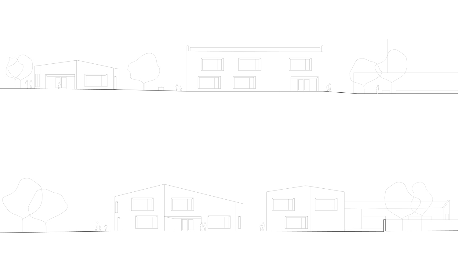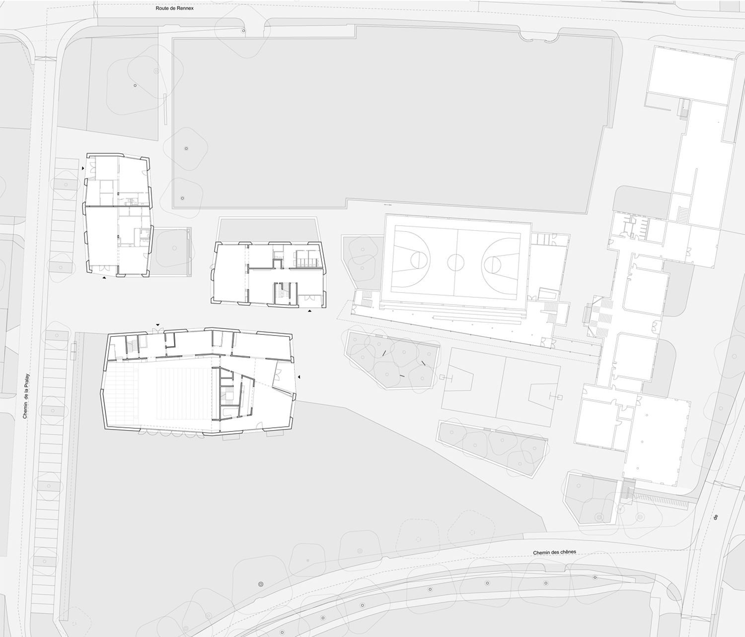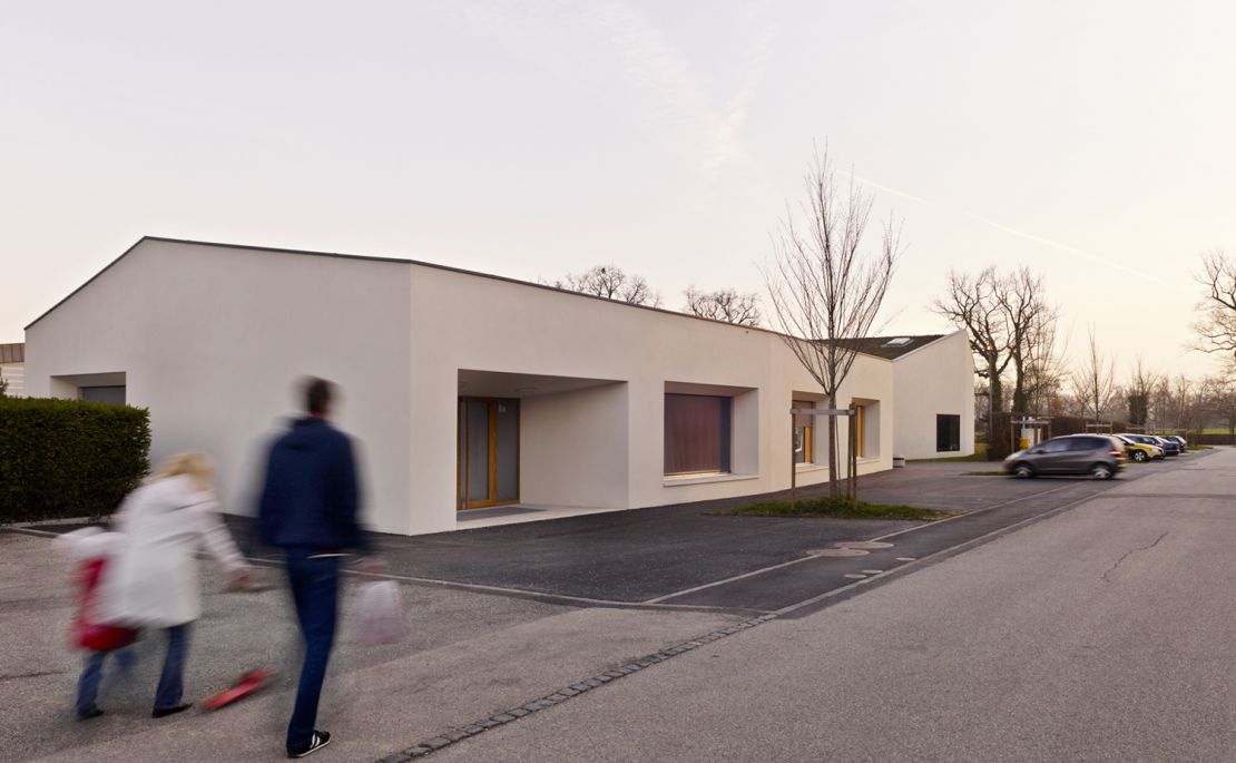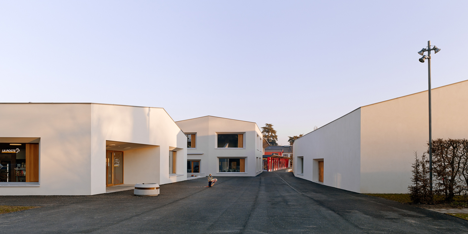 Les dimensions des trois constructions respectent l'échelle du village et des habitations pavillonnaires. L'implantation des volumes définit une suite d'espaces publics dans la continuité de parcours piétons alentours. Leur disposition crée un ensemble ouvert en forte relation avec son contexte.