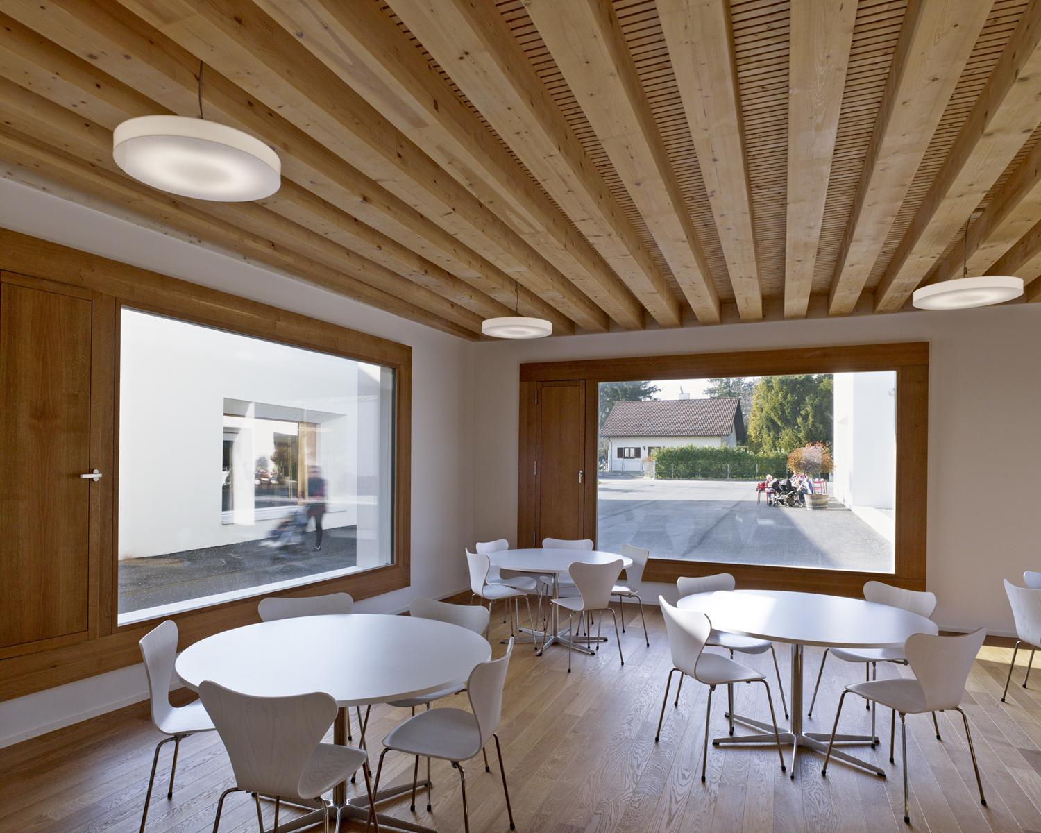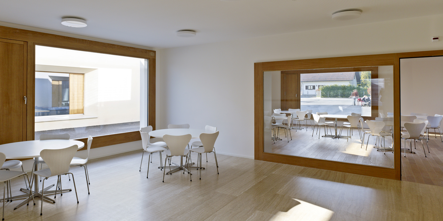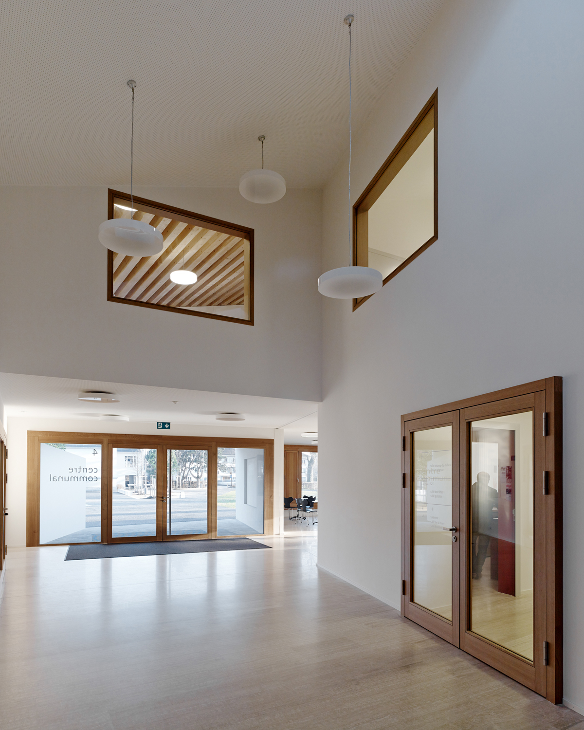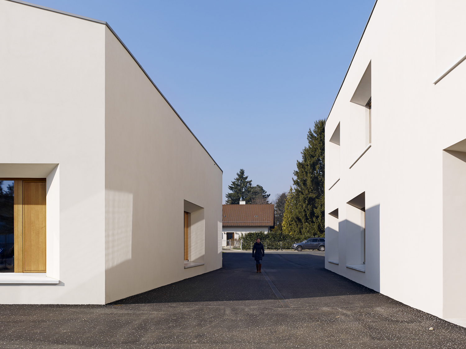 Les dimensions des trois constructions respectent l'échelle du village et des habitations pavillonnaires. L'implantation des volumes définit une suite d'espaces publics dans la continuité de parcours piétons alentours. Leur disposition crée un ensemble ouvert en forte relation avec son contexte.