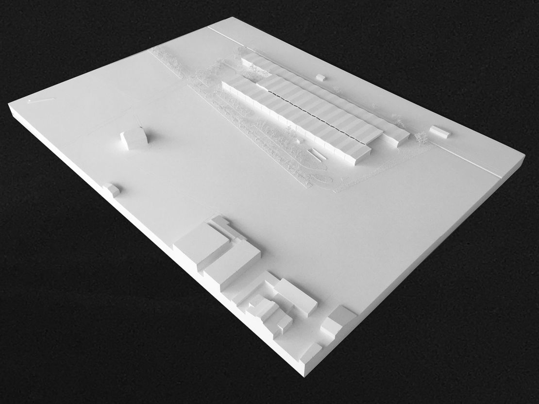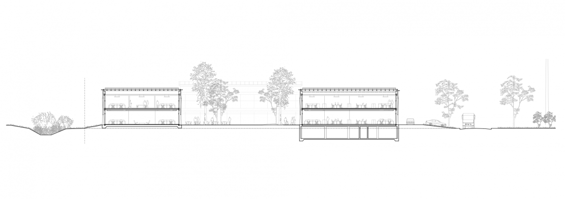 Cette nef industrielle est constituée de trois travées en coupe basilicale. Elle est organisée en bandes avec deux ailes et un coeur commun constitué d'un côté d'un parc d'accès et de l'autre du parking des véhicules spéciaux de plein-pied. L'organisation en bandes amène une flexibilité programmatique et d'usage pour le Maitre de l'Ouvrage. Le projet peut, ainsi, être pensé pour un programme minimum et s'allonger en fonction de l'évolution des besoins.