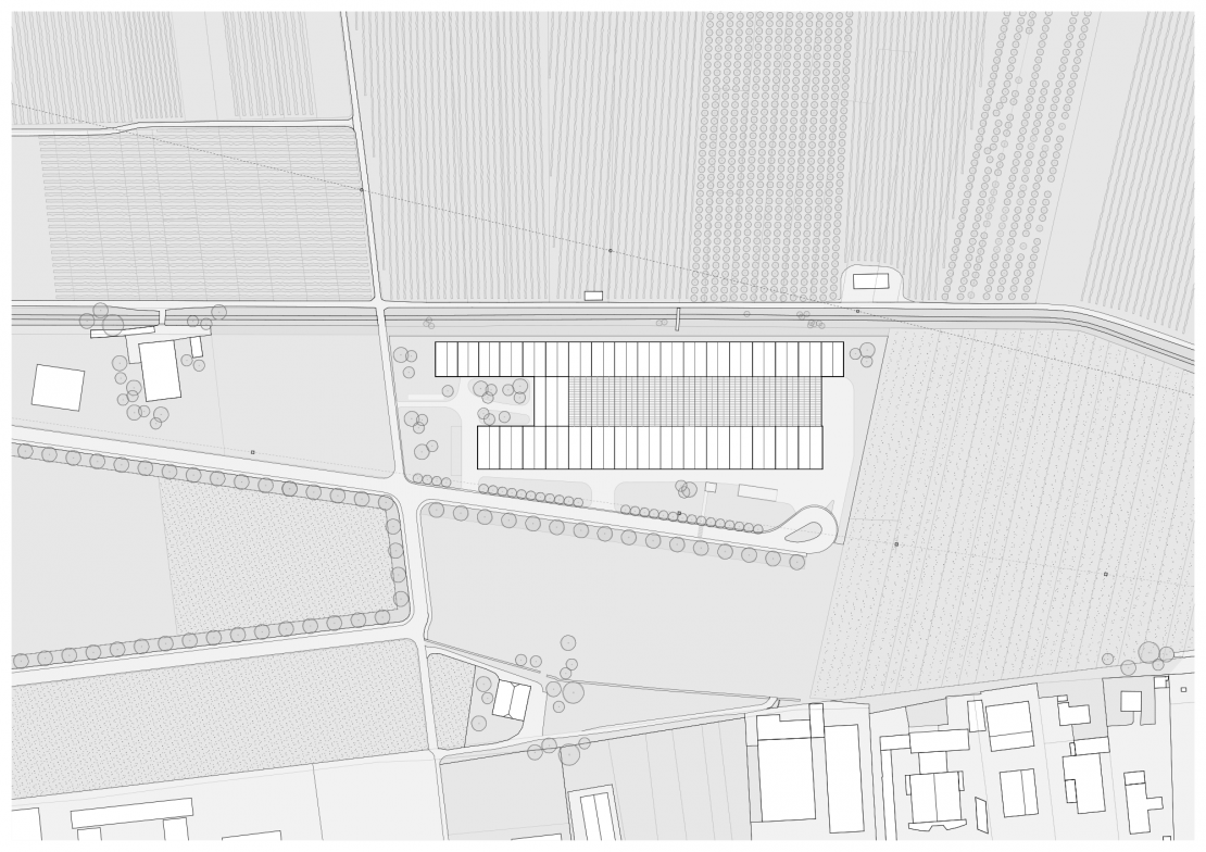 La structure hors-sol en bois est composée de deux ordres: une structure primaire longitudinale constituée de cadres en BLC à trois articulations et une structure secondaire transversale. La travée longitudinale centrale est superposée à la structure primaire et se distingue par sa hauteur. Elle est éclairée et ventilée naturellement. Comme autant de référence à la zone agricole pré-existante, cette structure fait écho autant à la structure des serres qu'à celles des alignements d'arbres ou des vignes alentours. L'expression du bois, le mélèze, suit la logique de son environnement. Patiné par le temps à l'extérieur et clair à l'intérieur, il participe à l'identité du bâtiment et à un environnement de travail chaleureux.