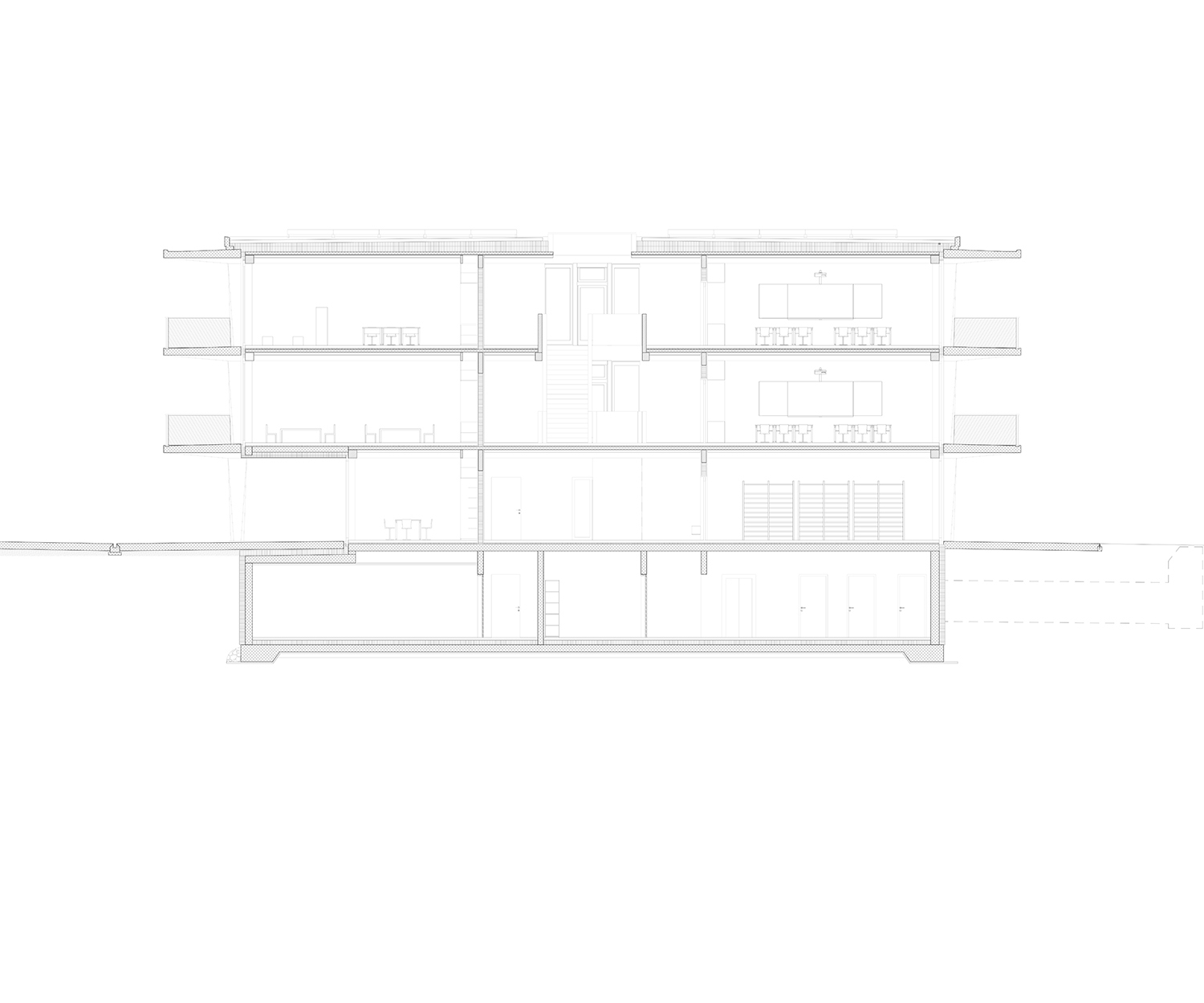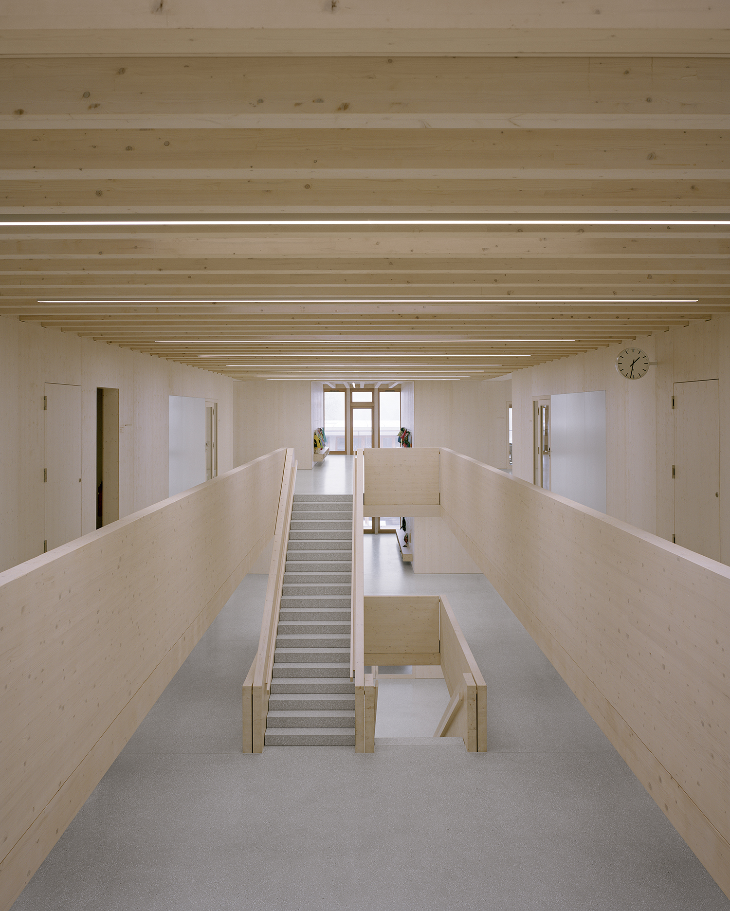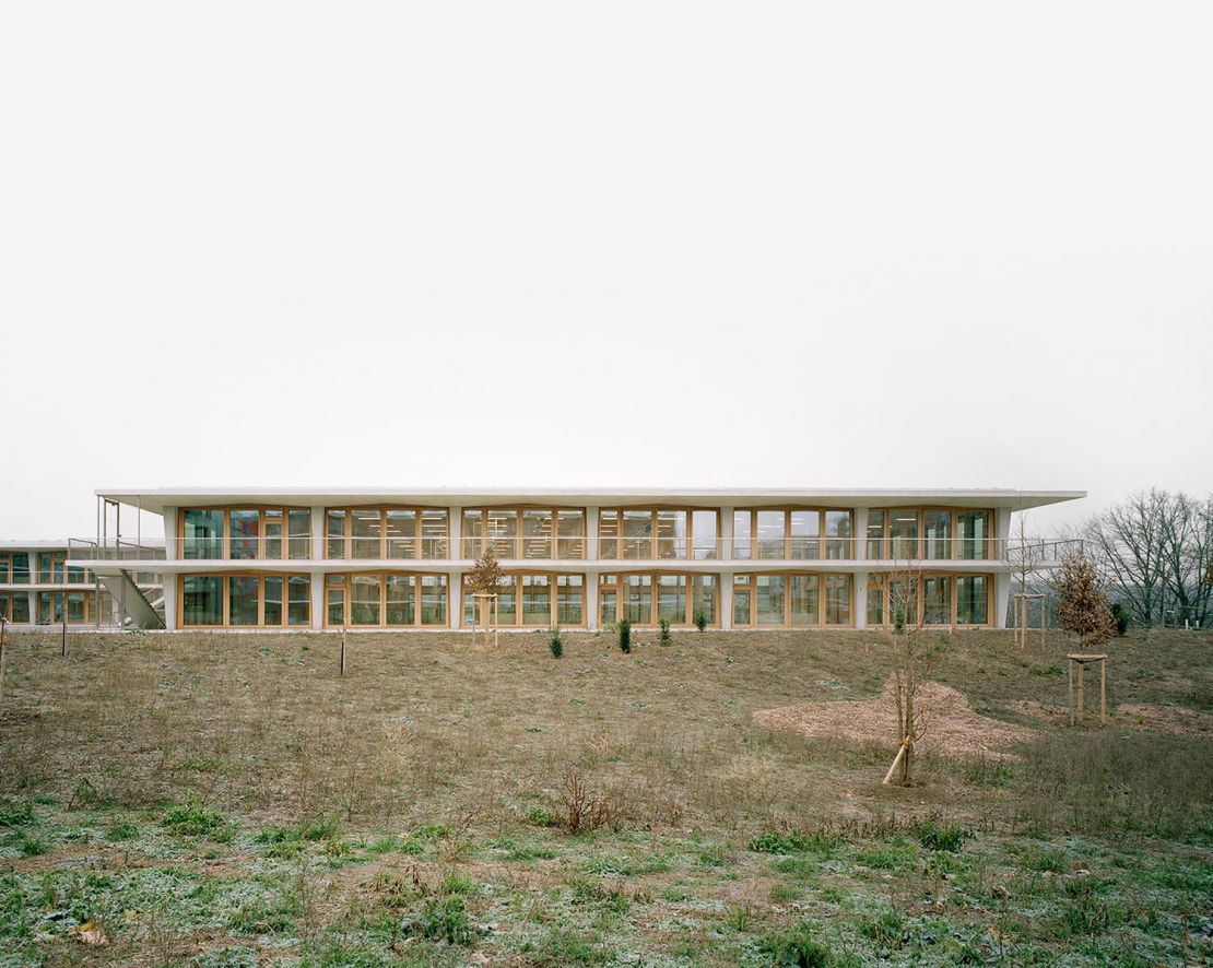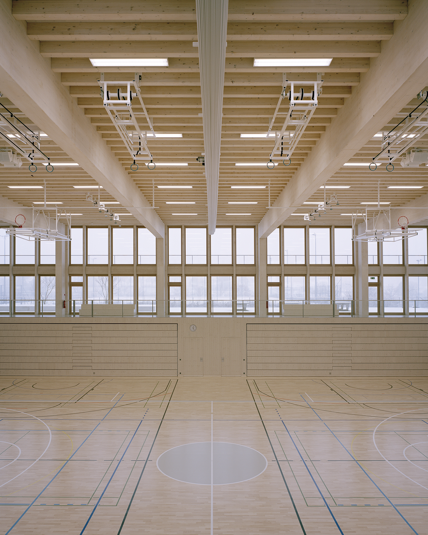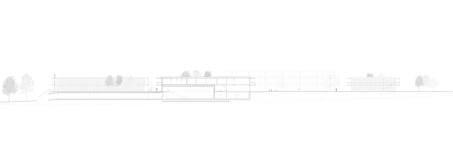 Le rez-de-chaussée et le sous-sol habritent les accès principaux et les espaces dédiés aux publics divers qui fréquentent la salle de sport, le restaurant, l'aula, les salles spécialisées et les espaces de réunions. Les salles de classes et les locaux scolaires se situent aux étages supérieurs. Tous les espaces bénéficient d'un généreux éclairage naturel et se prolongent par des espaces extérieurs. Tous jouissent de vues sur le paysage.