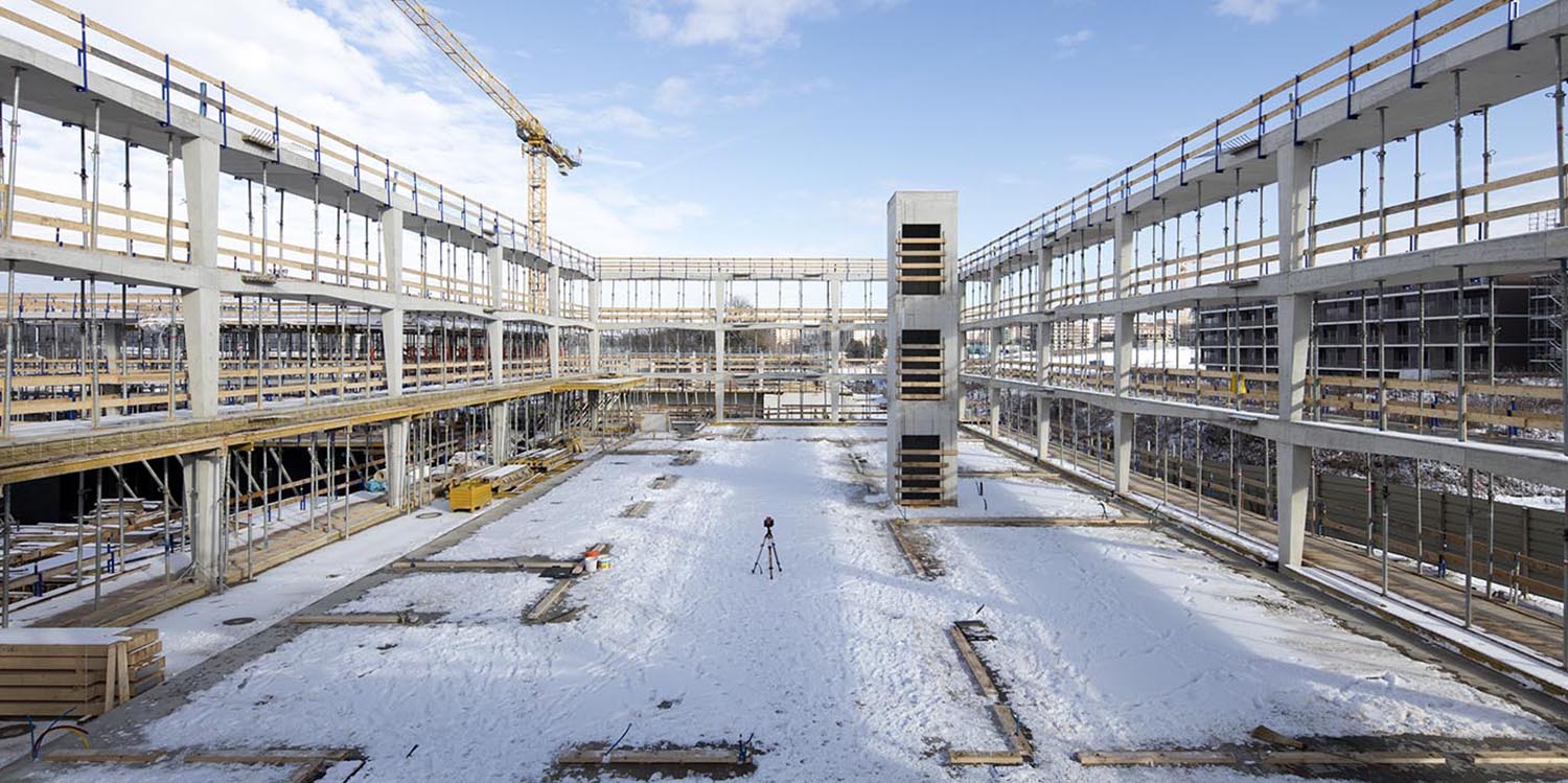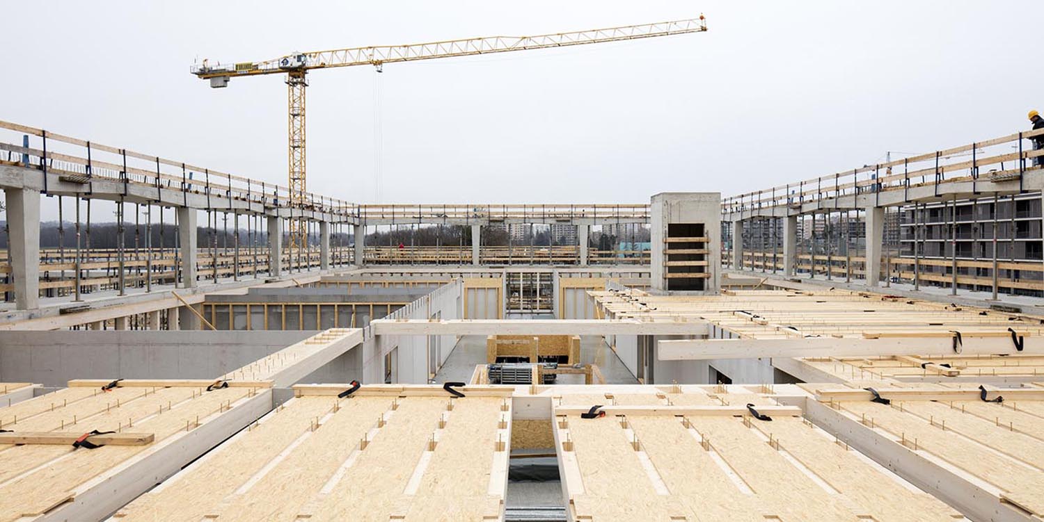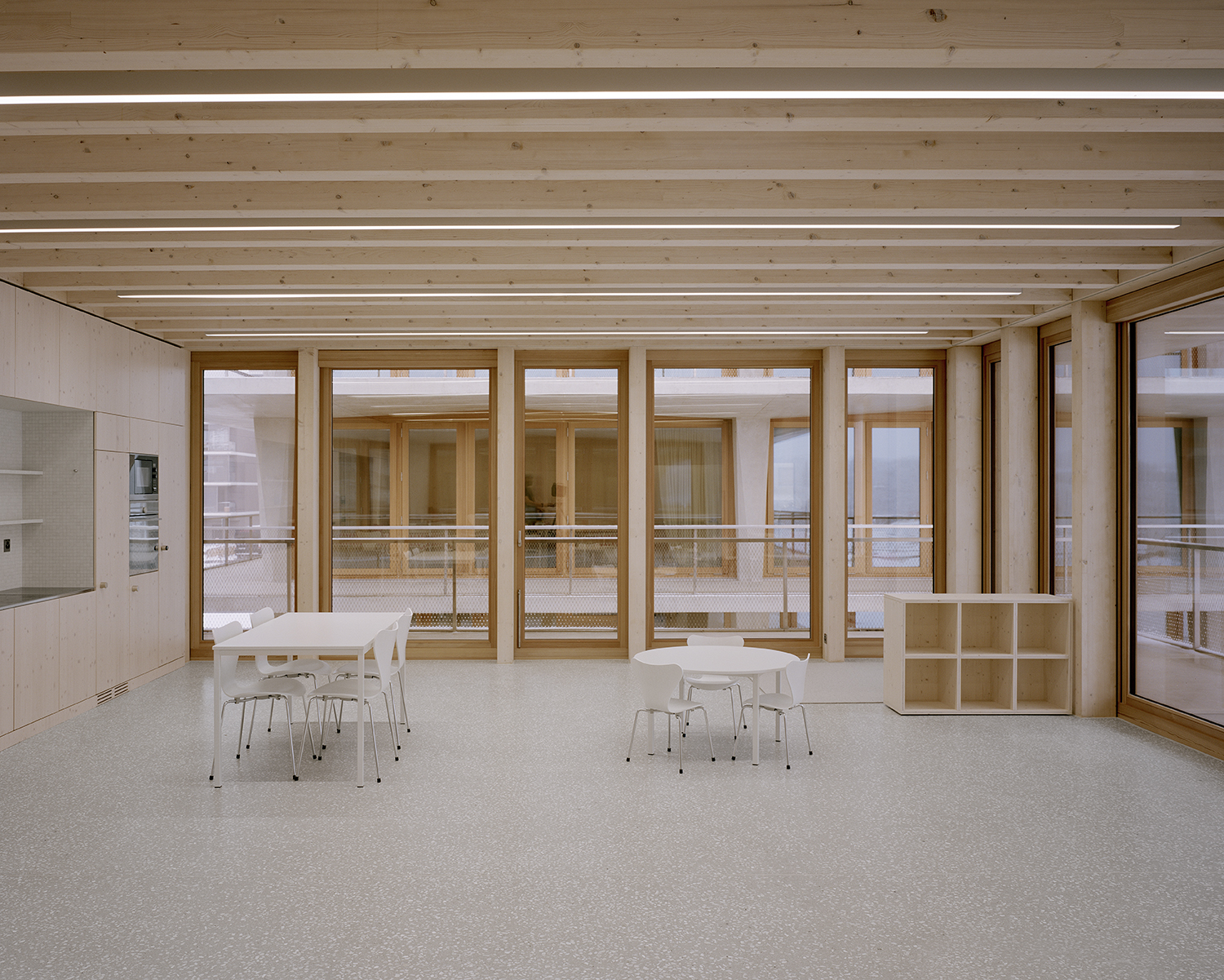 La structure des constructions combine les qualités du béton et du bois. A l'intérieur, une charpente en bois partitionne les espaces. En façade, des portiques en béton armé forment une ossature durable qui remplit plusieurs fonctions. Tout en jouant le rôle de coursives et de voies d'évacuation, les avant-toits protègent les fenêtres, permettent de se passer de stores extérieurs et autorisent une relation plus libre et plus forte avec le paysage. En renforçant la stabilité des bâtiments, cette structure périphérique libère les espaces intérieurs, qui offrent de très nombreuses possibilités d'aménagement.