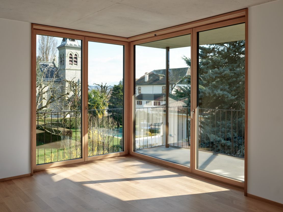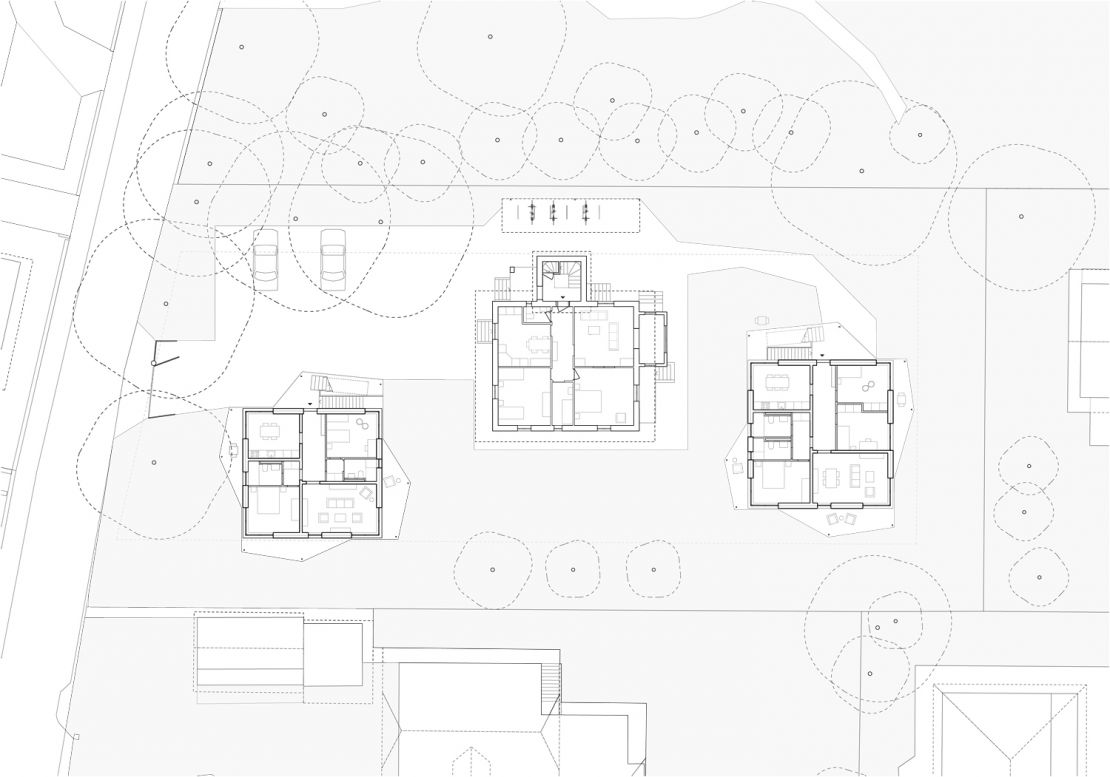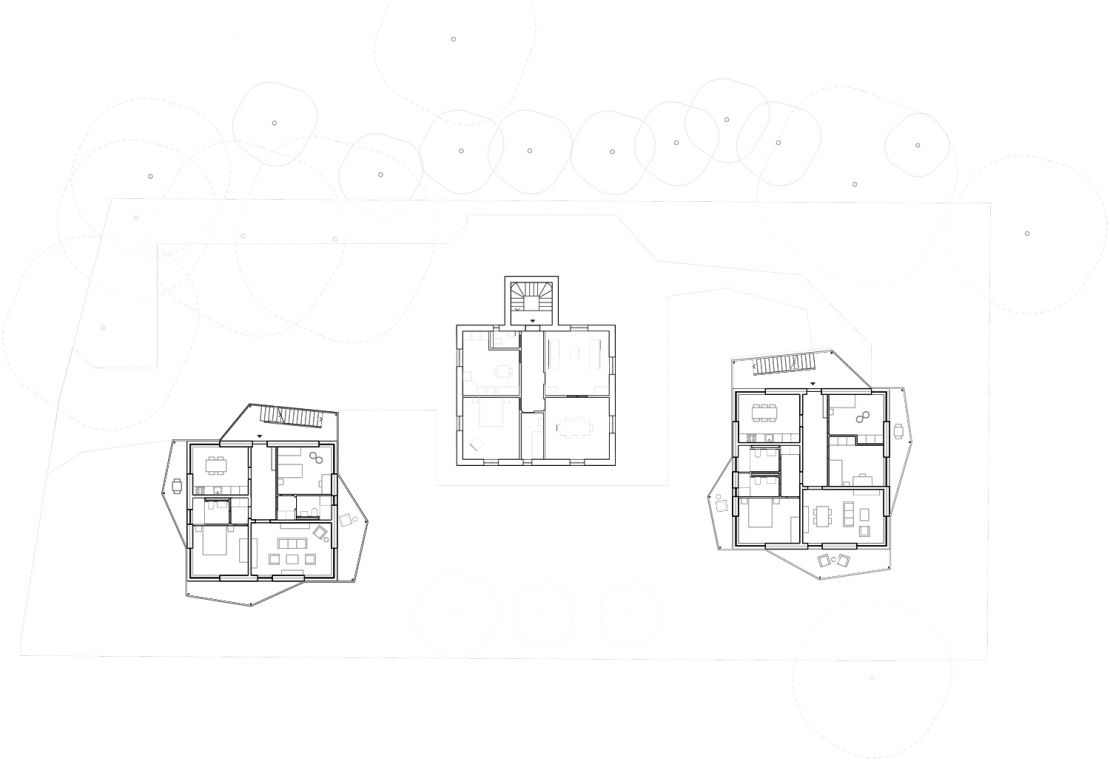 En occupant la totalité de leur niveau, les appartements rappellent la typologie de la maison ancienne. Chacun jouit de quatre orientations et chaque pièce d'une double orientation. Combinée à un principe de décalages, cette configuration permet aux trois bâtiments d'être proches les uns des autres tout en profitant de vues dégagées.