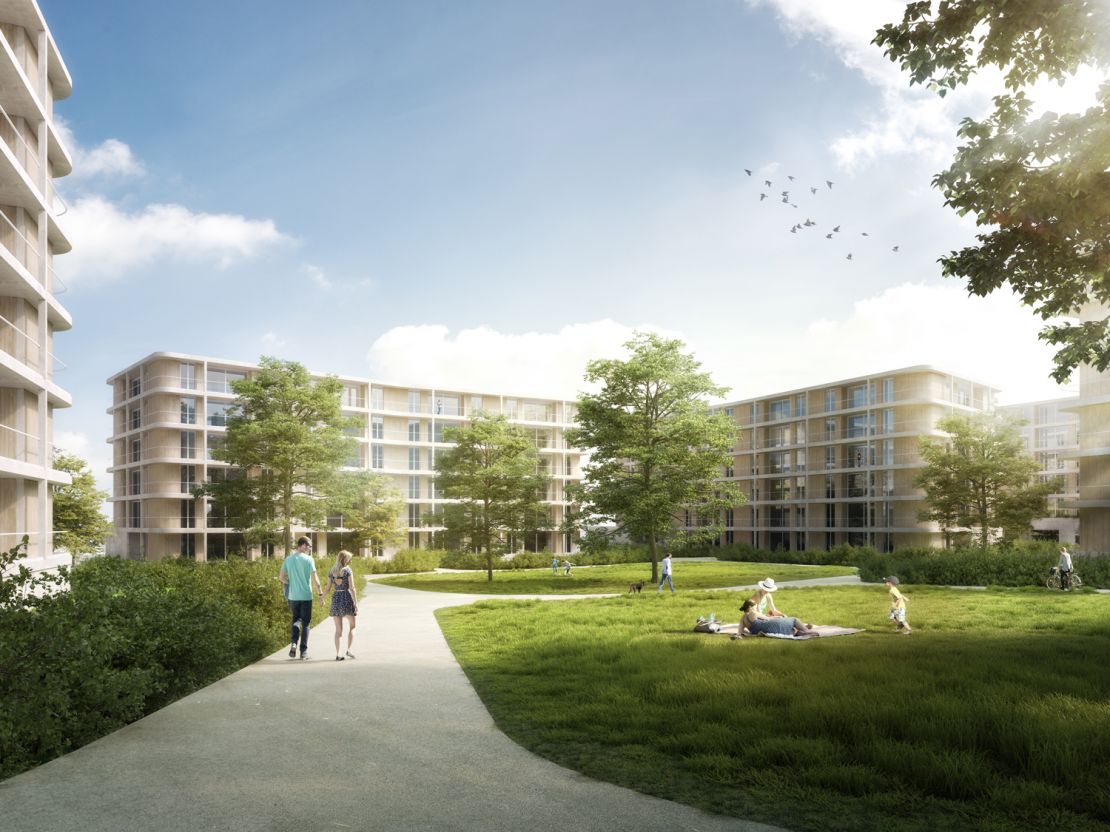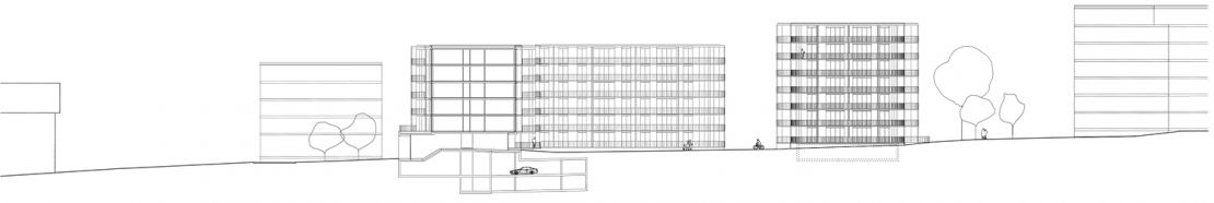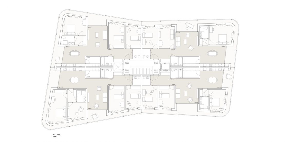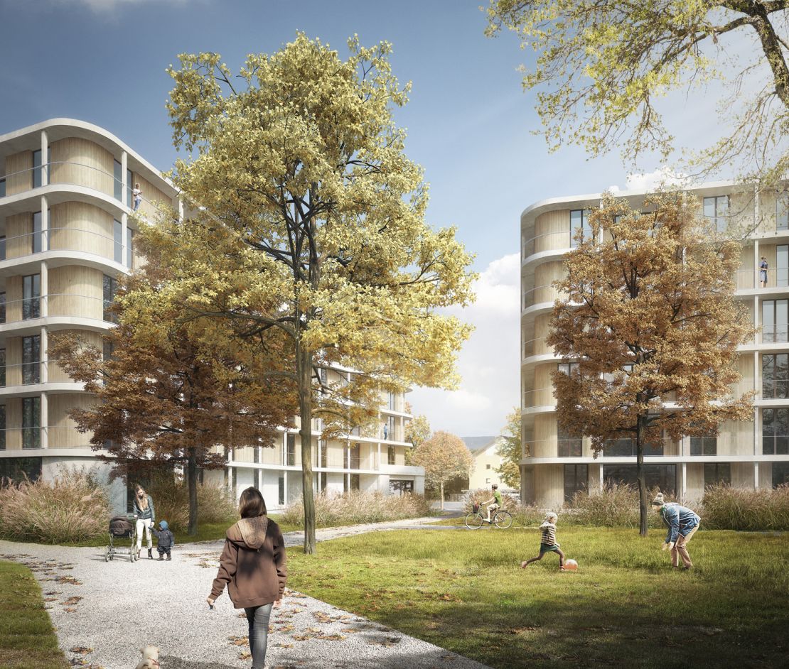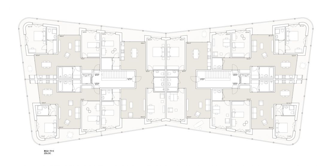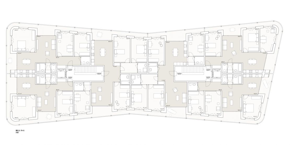 Les volumétries diverses des immeubles sont pliées sur deux côtés. Ce renfoncement brise le caractère habituellement linéaire de ce type de bâtiment. Il permet aussi de créer des typologies d'habitation particulières, avec des logements traversants placés au centre du plan, dans sa partie étroite, tandis que les extrémités arrondies accueillent les logements d'angles. La grande majorité des logements bénéficie ainsi de deux orientations et de points de vue variés sur le voisinage et le payage.