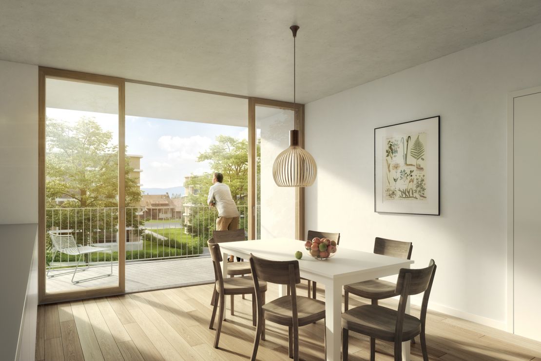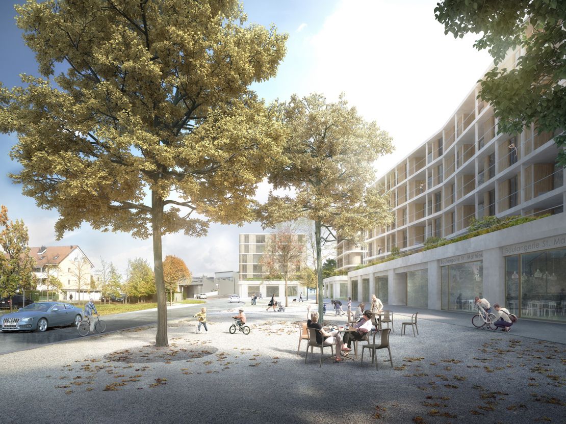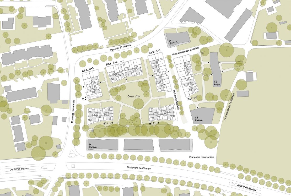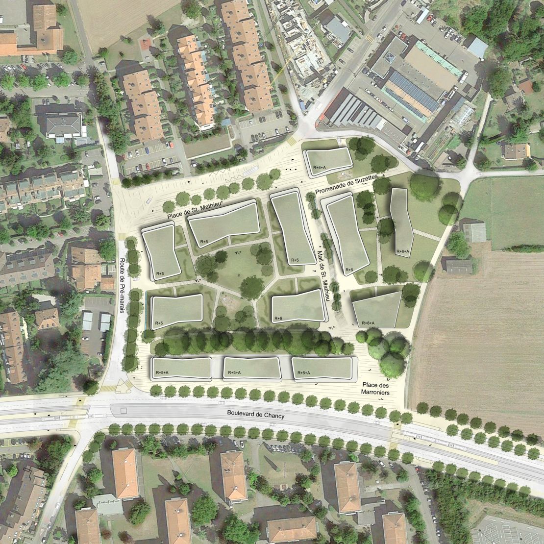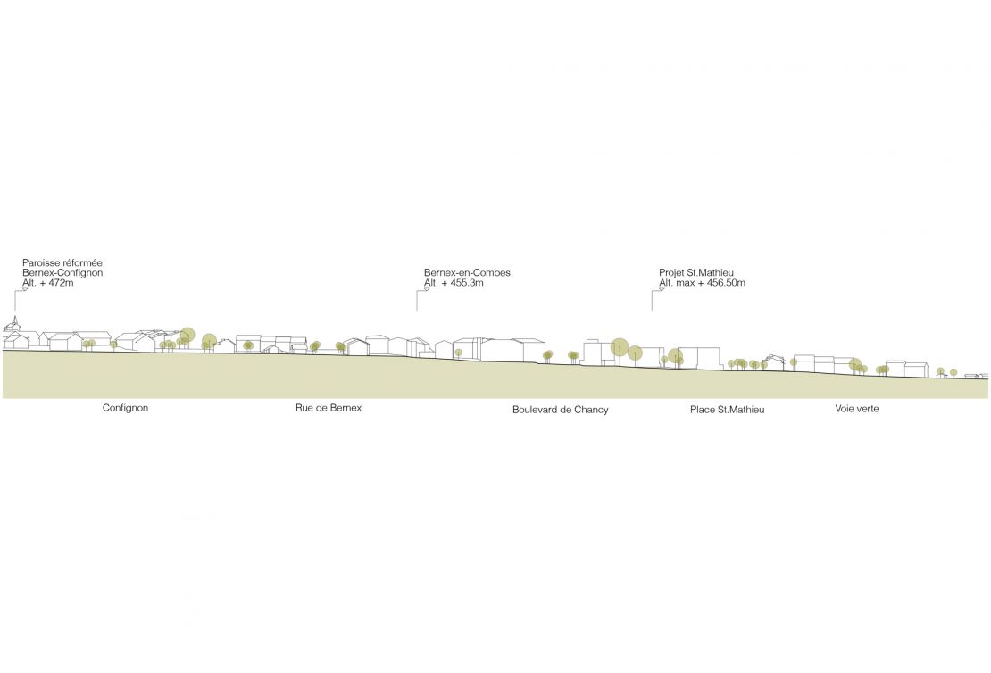 Cet ensemble urbain se déploie au sein du nouveau quartier de Saint-Mathieu, en bordure de l'agglomération genevoise.