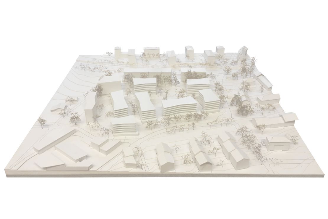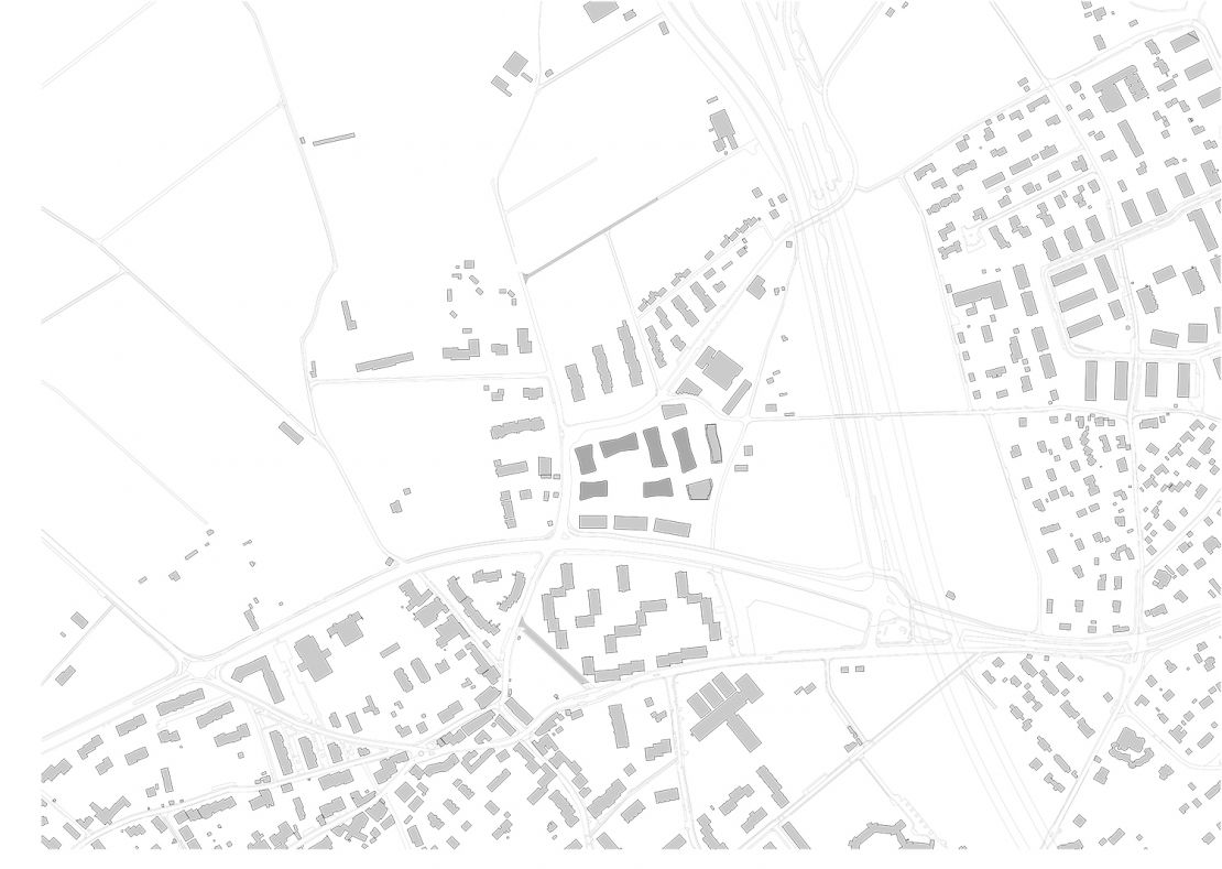 Le projet réinterprète un plan de quartier pré-existant. Il propose un îlot formé de six bâtiments indépendants dont les volumes respectent les dimensions du tissu urbain et rural environnant. Couronné d'espaces publics, l'ensemble entoure un coeur d'îlot paysagé.