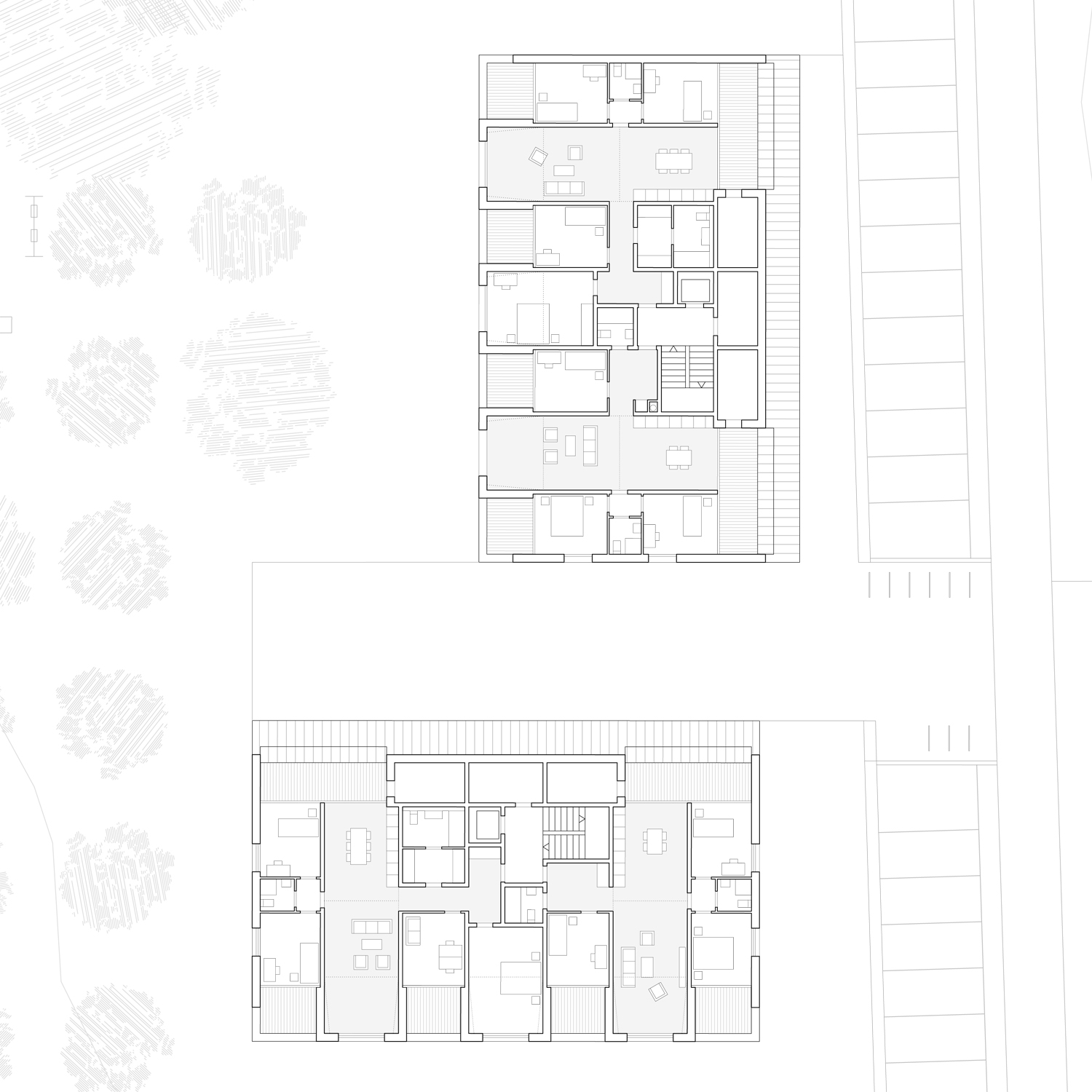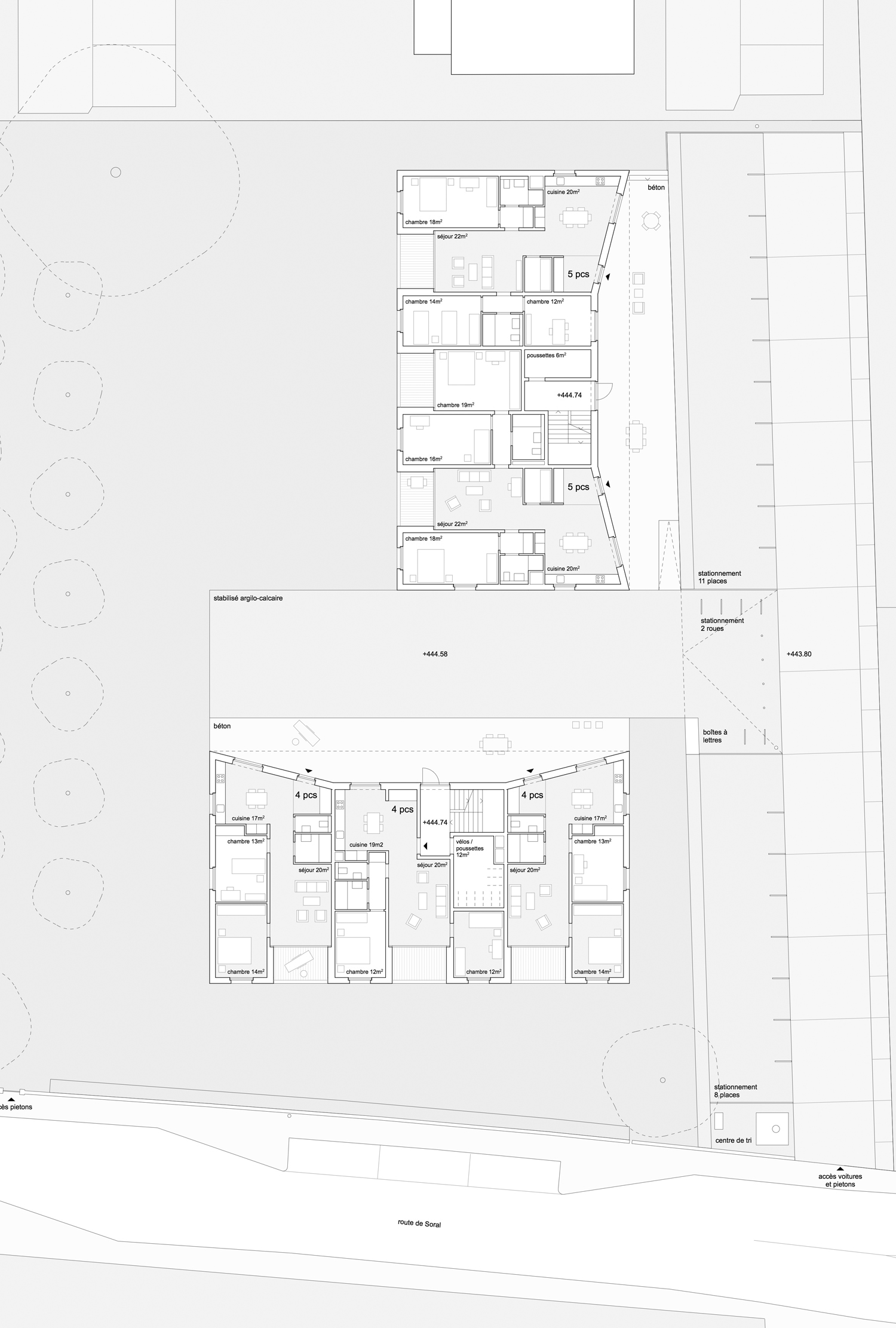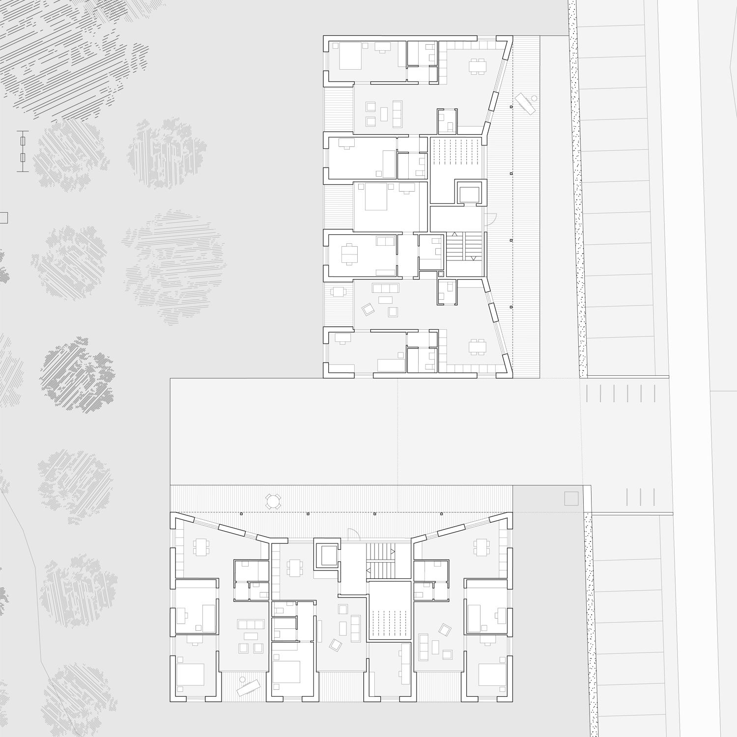 La première intention du projet consistait à intégrer ces immeubles de campagne de manière fine dans le site de la commune. Nous voulions que leur architecture ait un caractère à la fois rural, domestique et contemporain. Il s'agissait également d'établir une relation forte entre les deux immeubles par le biais d'une cour centrale ouverte sur un verger situé en limite de parcelle.