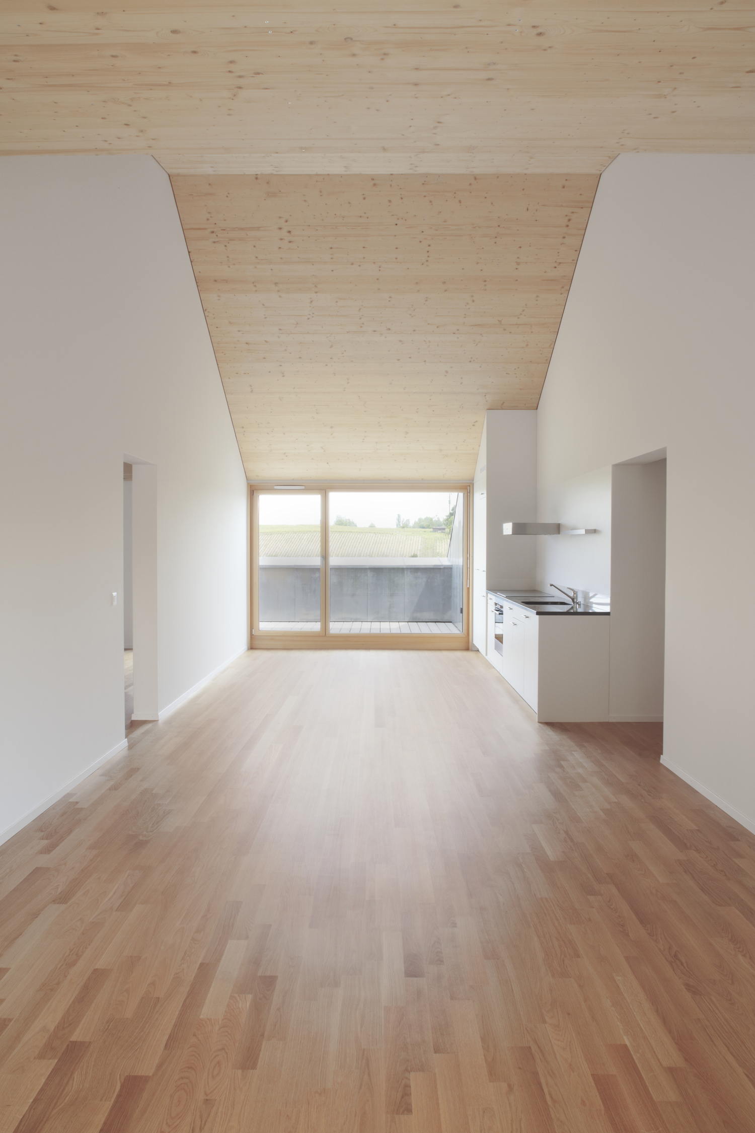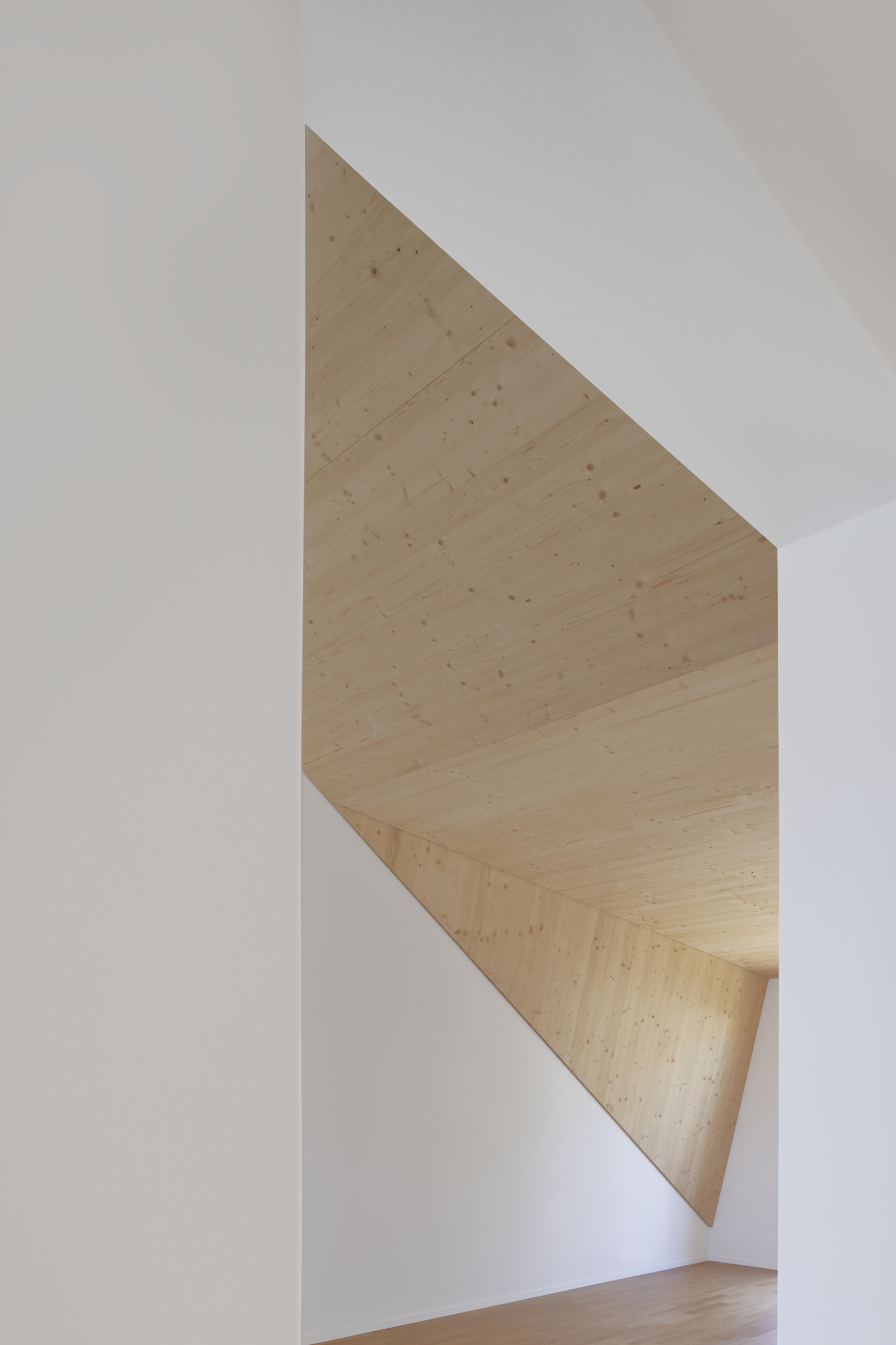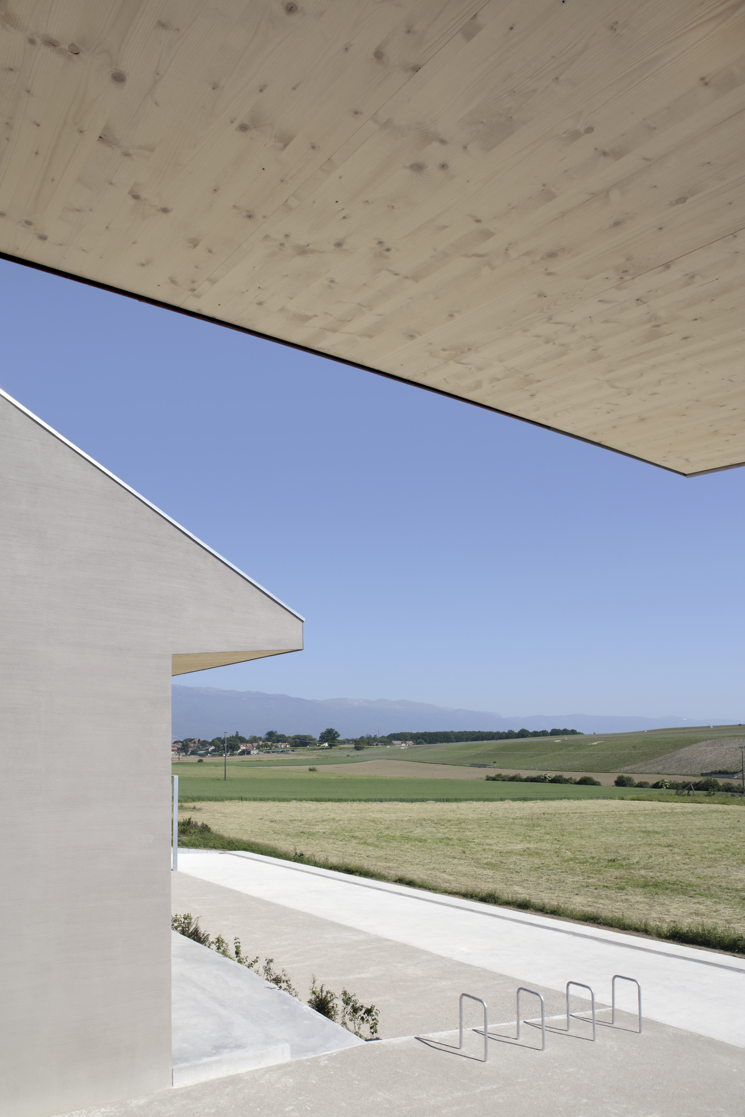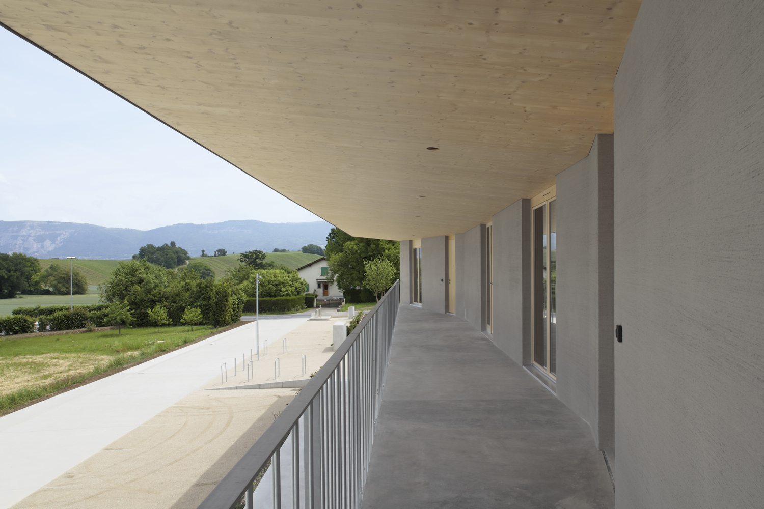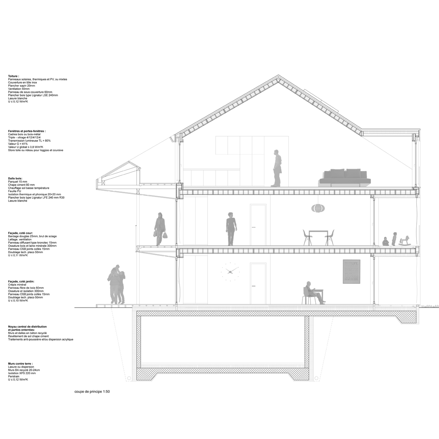 Le système constructif est mixte. Les murs sont en béton, l'ossature des façades et les toitures en bois, tandis que les dalles associent bois et béton. Recouverte à l'extérieur d'un crépi minéral balayé, l'enveloppe est perméable à la vapeur d'eau et offre un excellent rapport entre épaisseur et performance énergétique. La toiture est intégralement recouverte de zinc naturel plaqué.