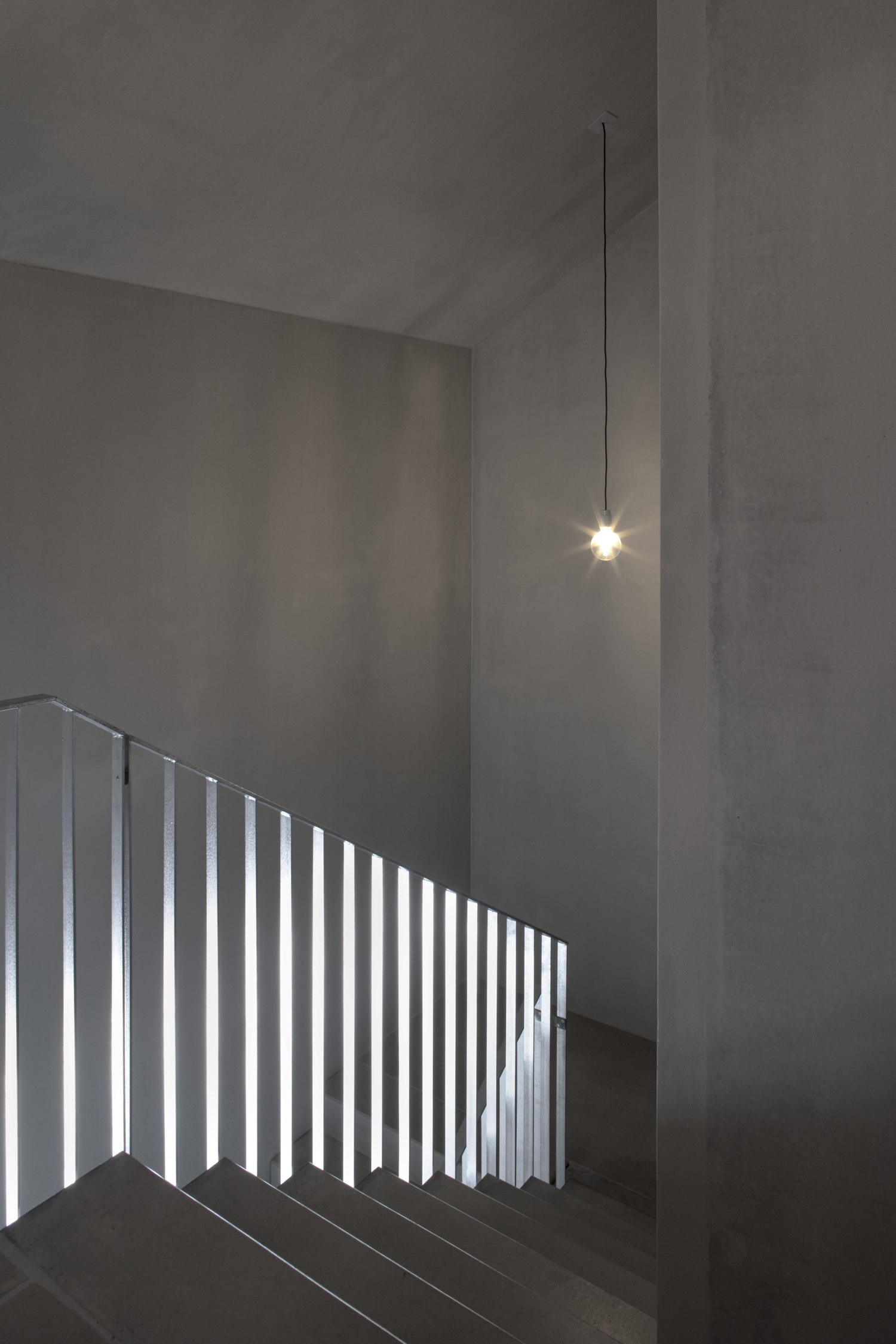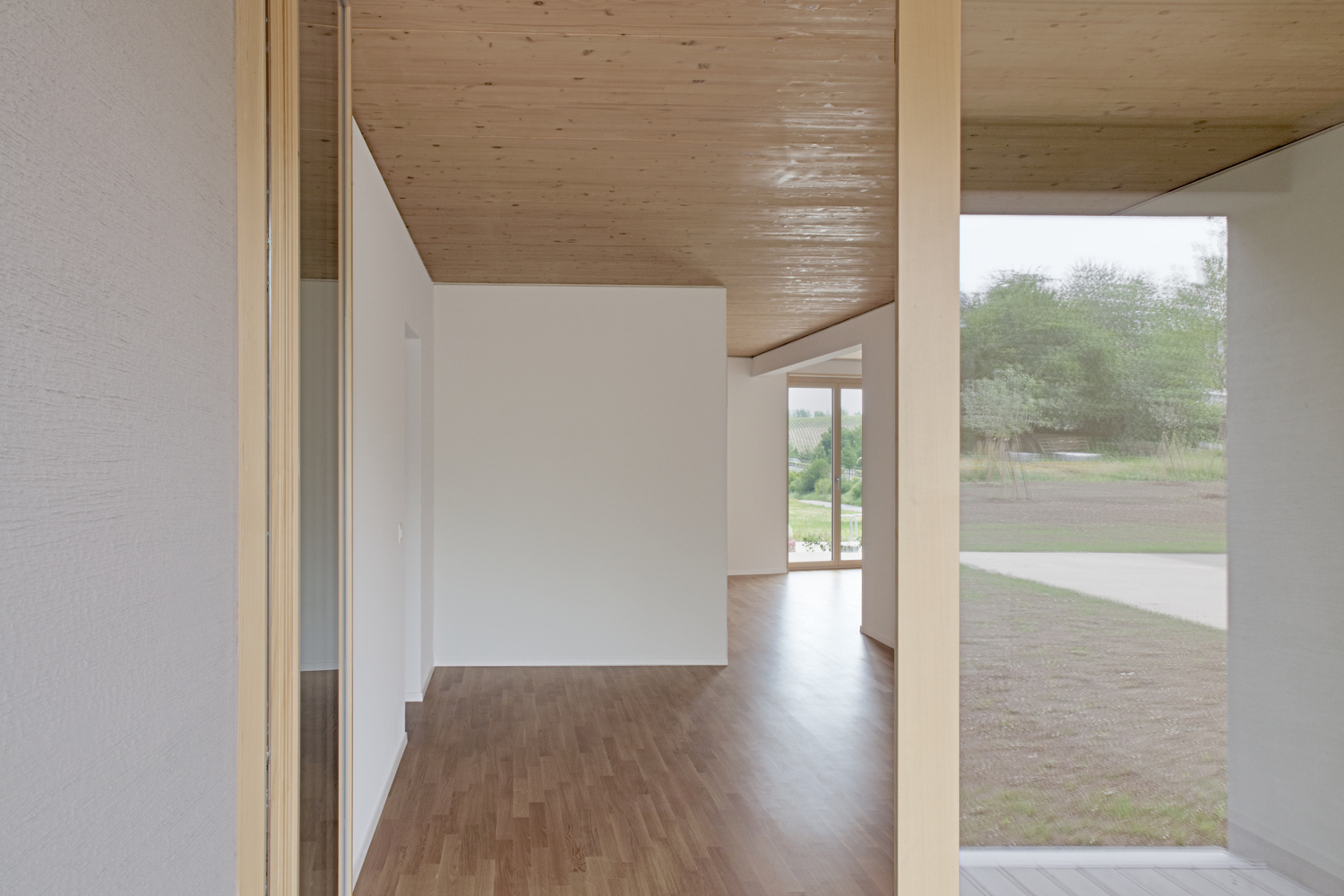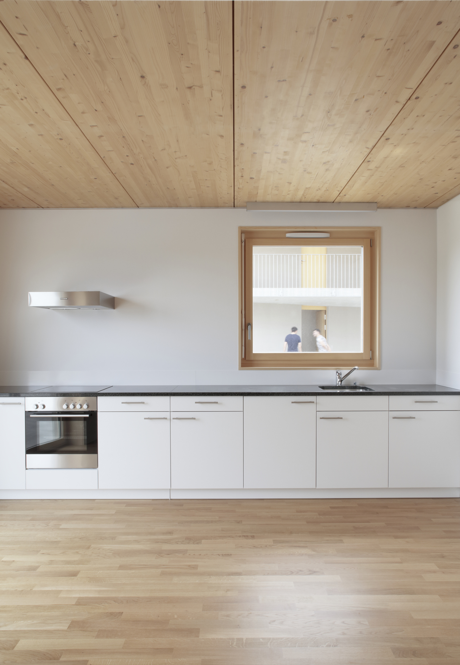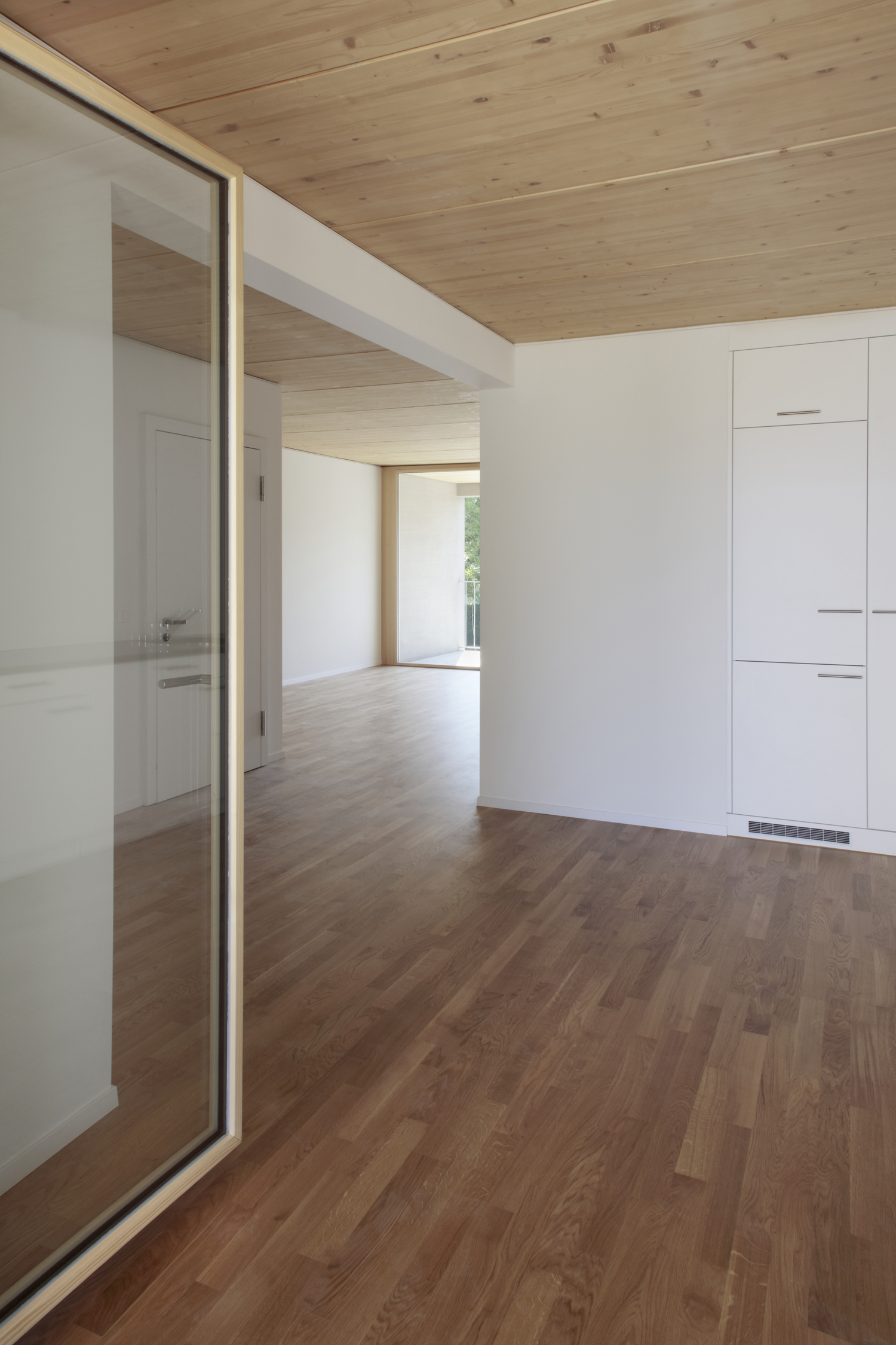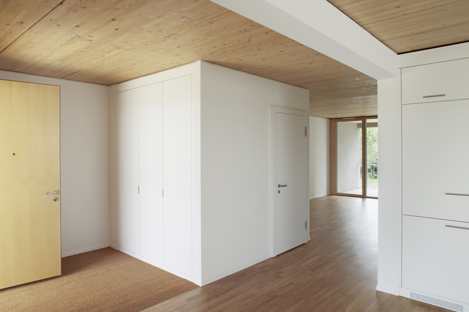 Le système constructif est mixte. Les murs sont en béton, l'ossature des façades et les toitures en bois, tandis que les dalles associent bois et béton. Recouverte à l'extérieur d'un crépi minéral balayé, l'enveloppe est perméable à la vapeur d'eau et offre un excellent rapport entre épaisseur et performance énergétique. La toiture est intégralement recouverte de zinc naturel plaqué.