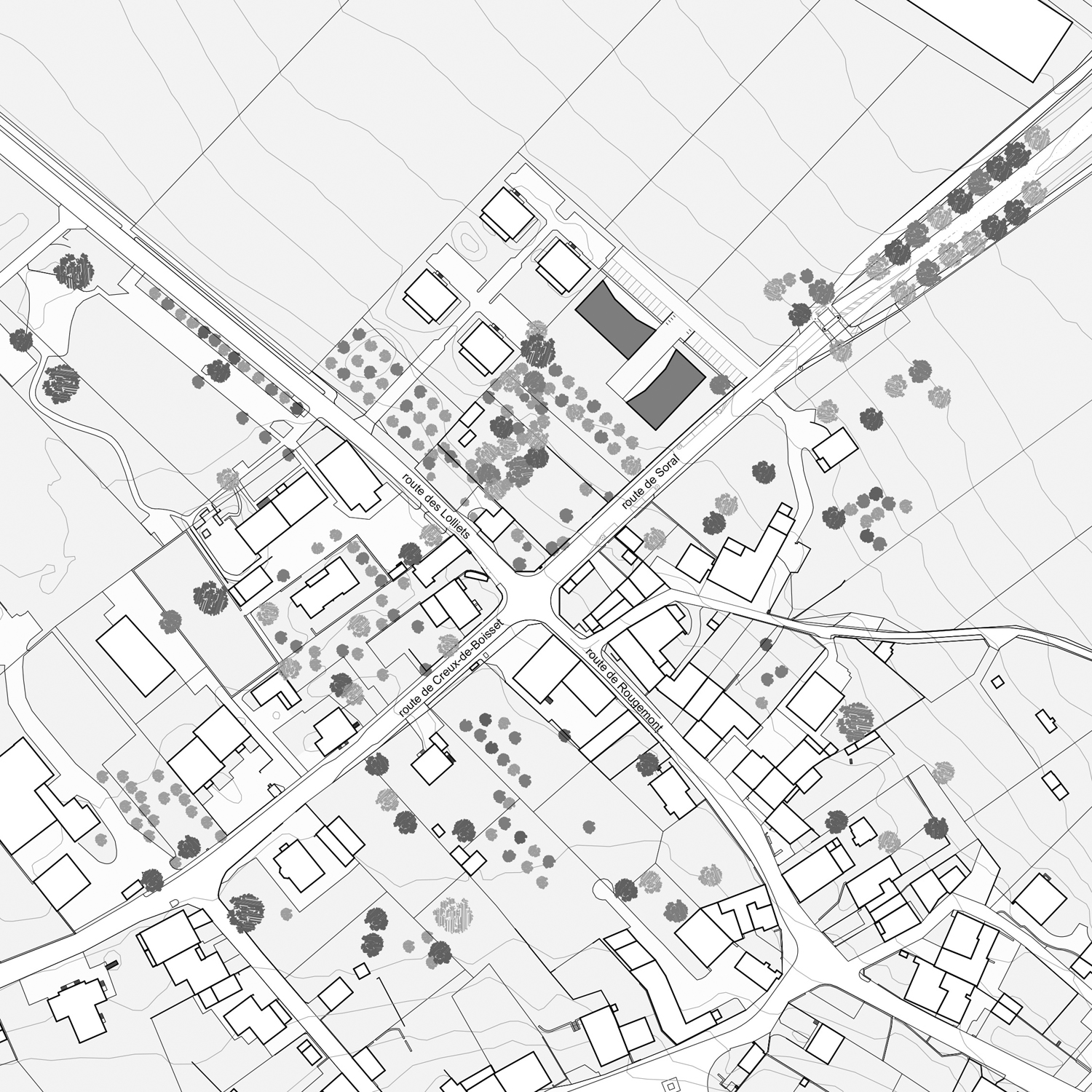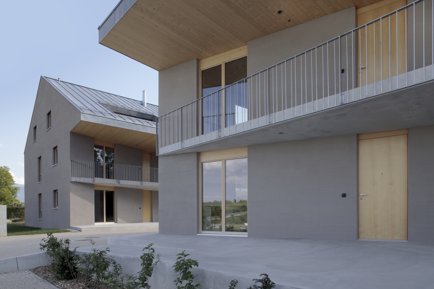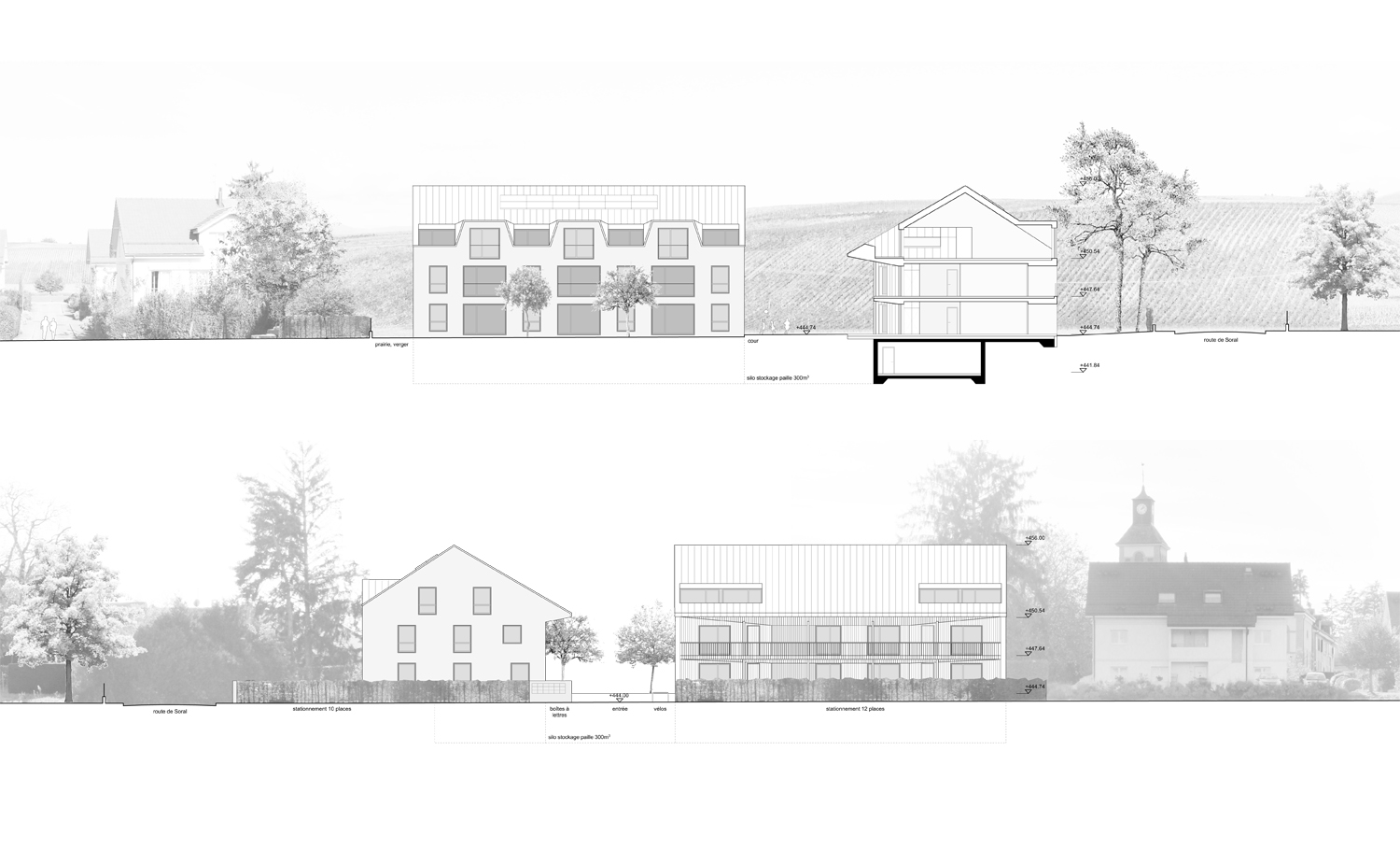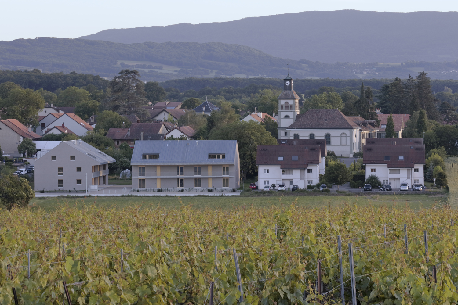 Ces deux immeubles d'habitation se situent à l'entrée du village genevois, face à un vaste paysage ouvert. Inscrit dans un plan de quartier en zone patrimoniale, leur programme comprend quatorze logements d'utilité publique.