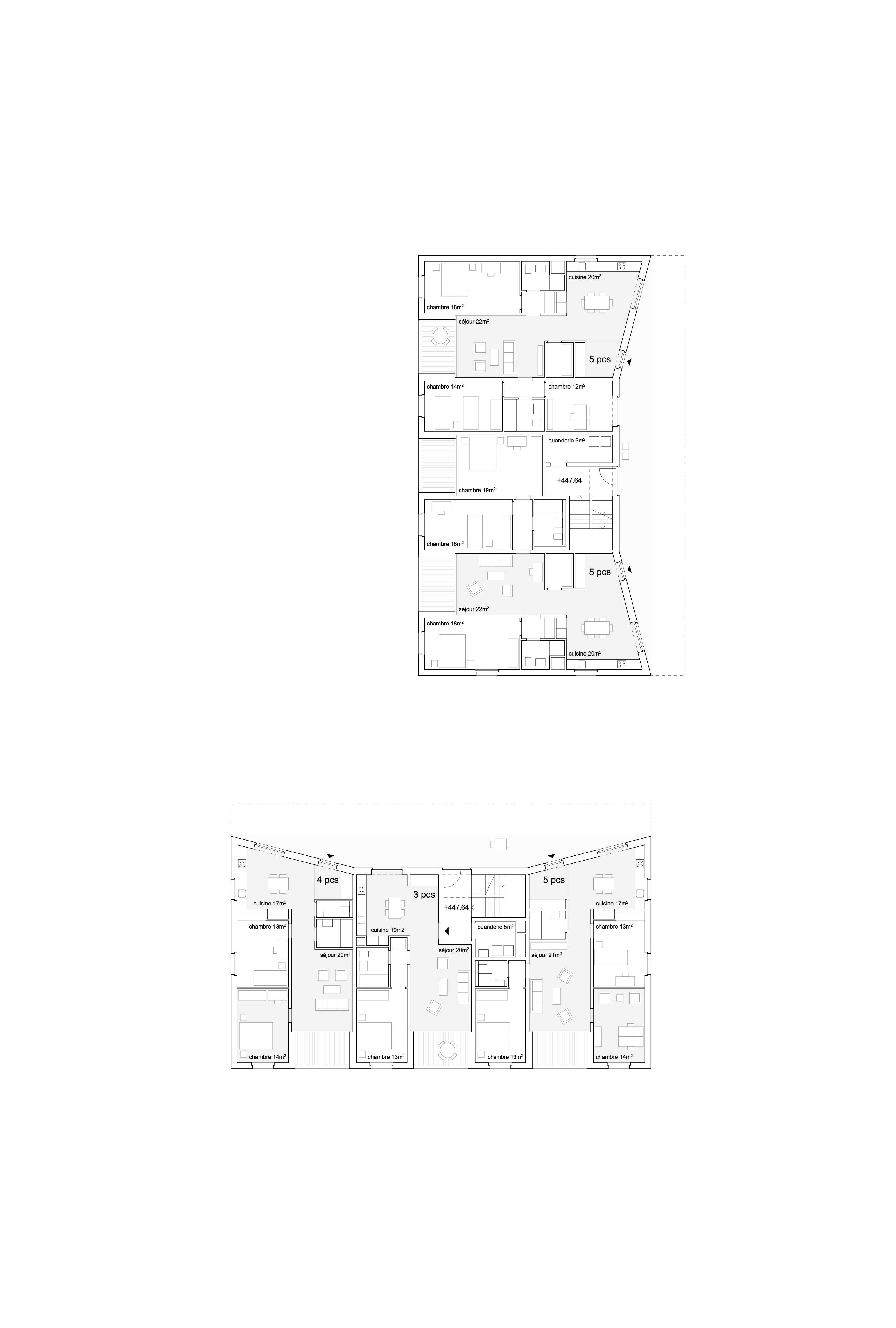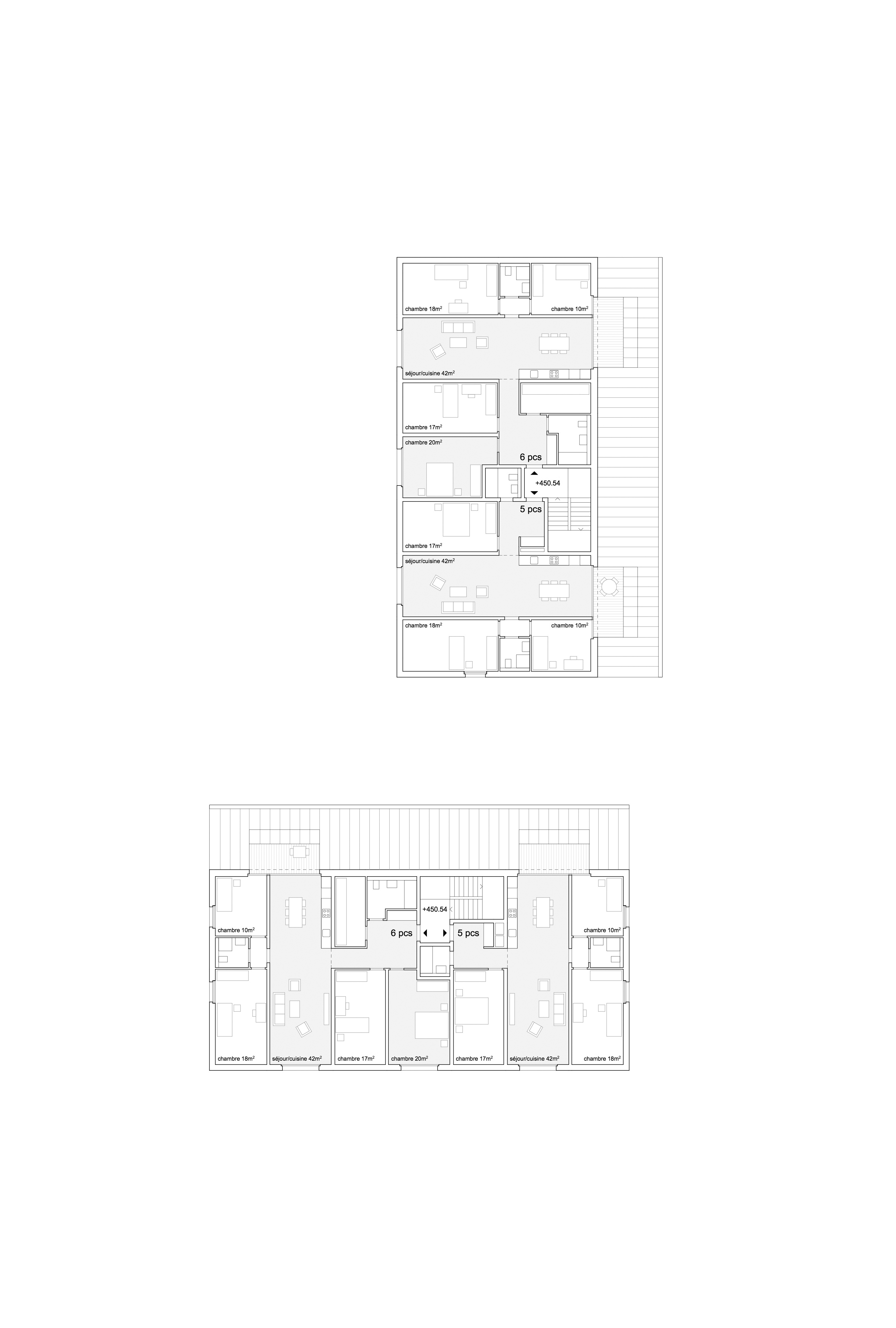 Le caractère traversant des logements tisse un lien entre cour et jardin. La cour est un lieu collectif. Sa nature d'espace partagé se matérialise par un large avant-toit qui protège une coursive d'accès aux logements et aux cuisines. Les jardins sont des espaces semi-privés sur lesquels donnent le séjour, les chambres et une loggia. Sous le toit, les volumes ont été conçus de façon à pouvoir être entièrement habitables.