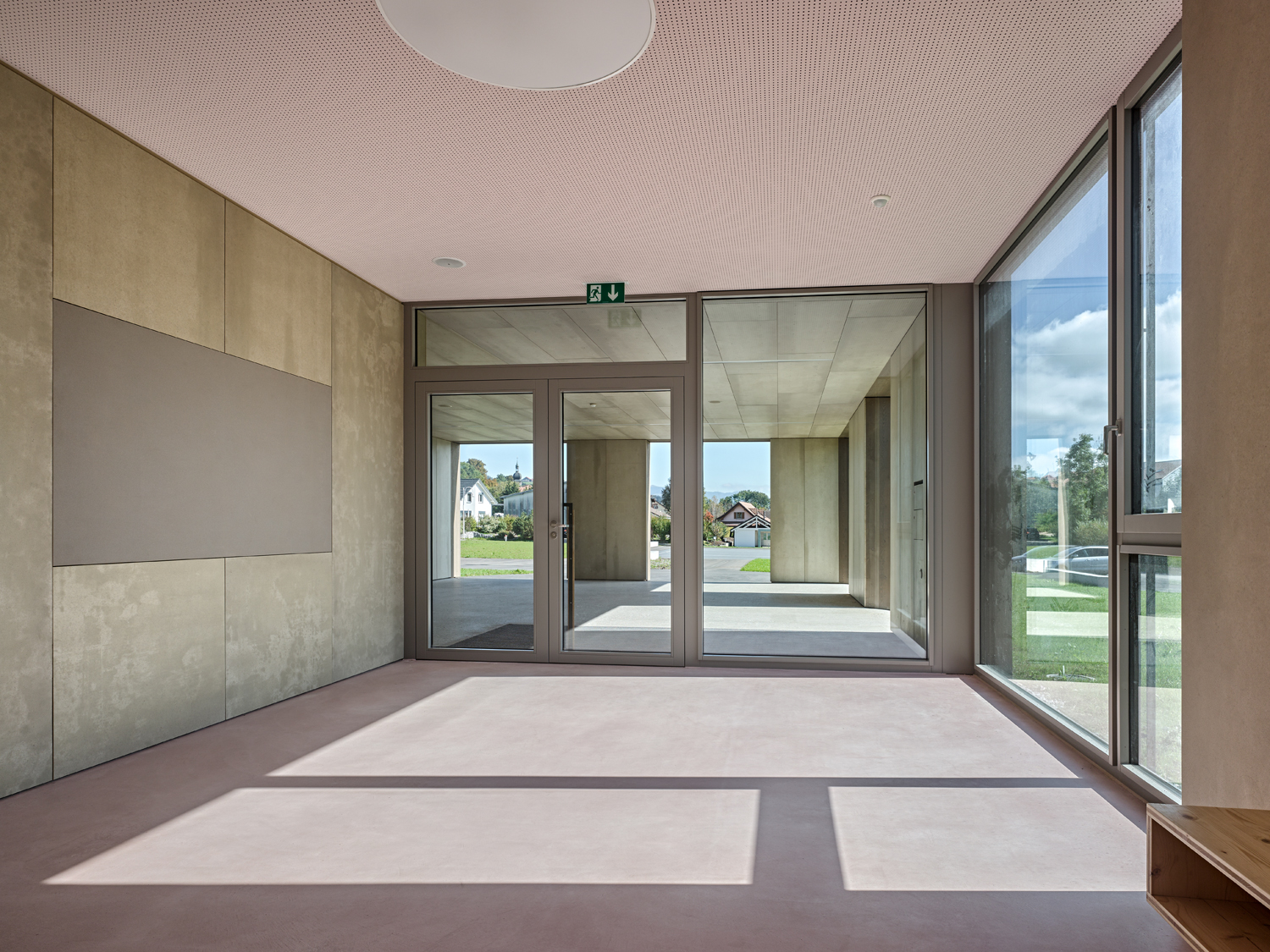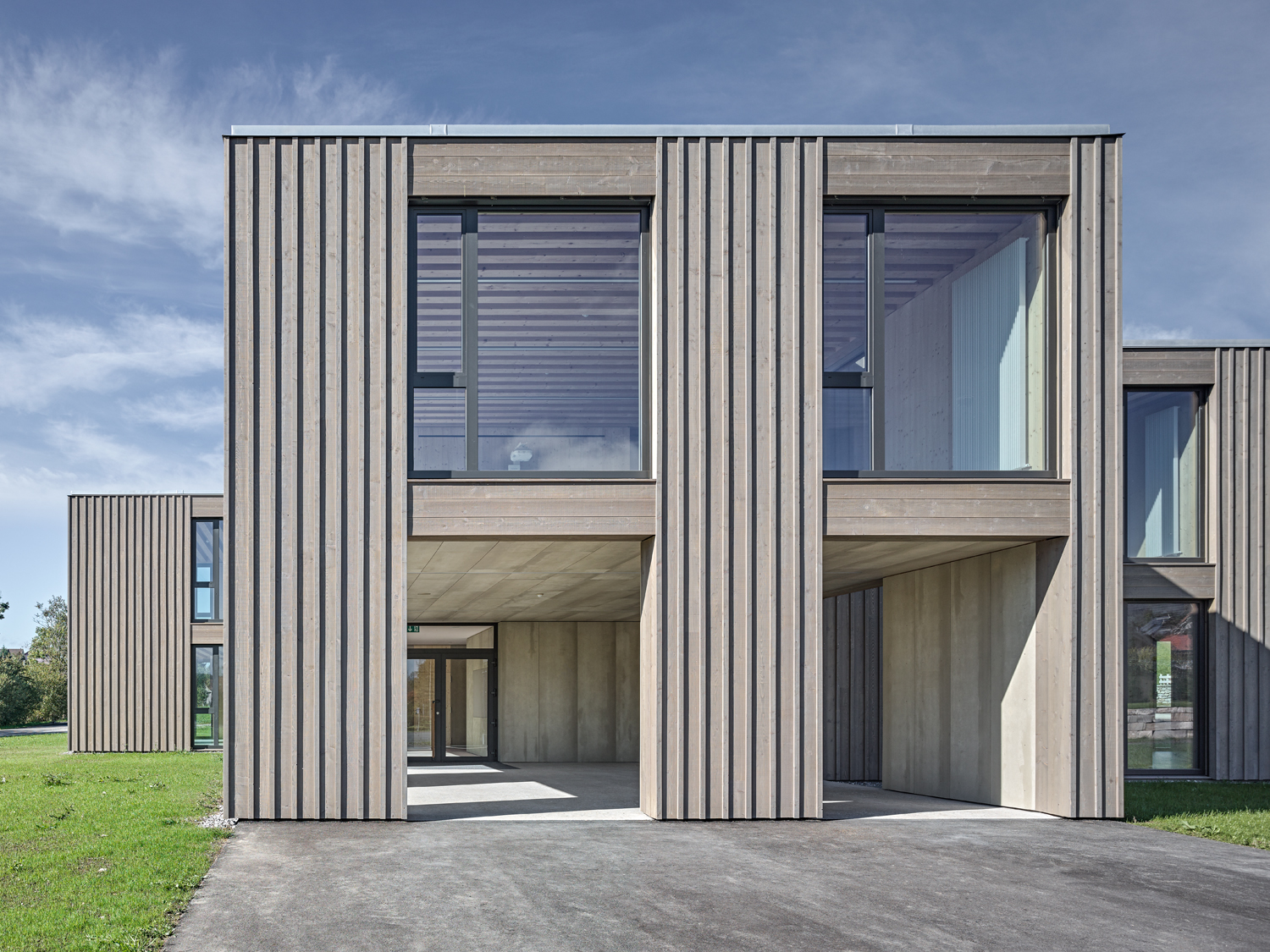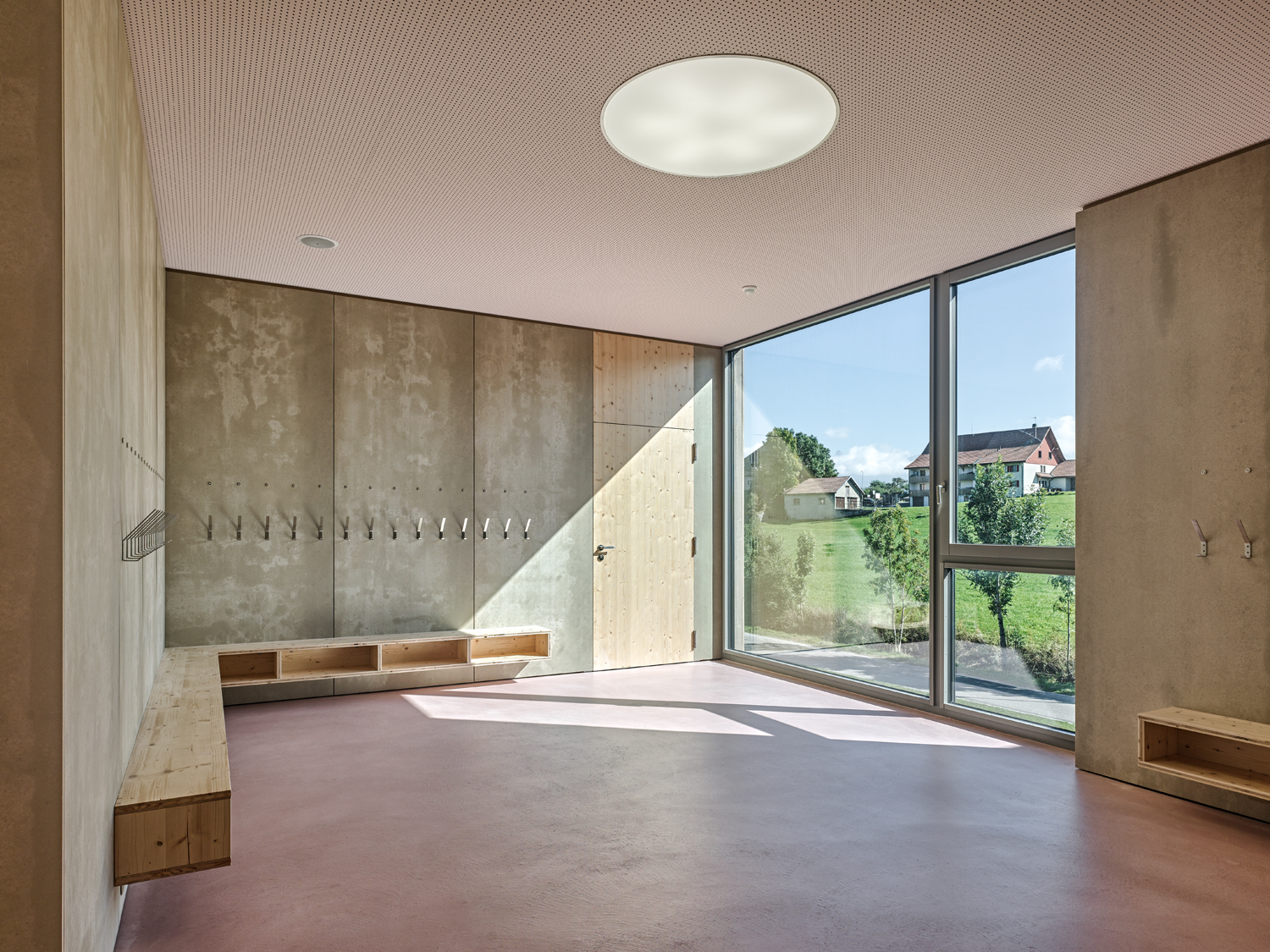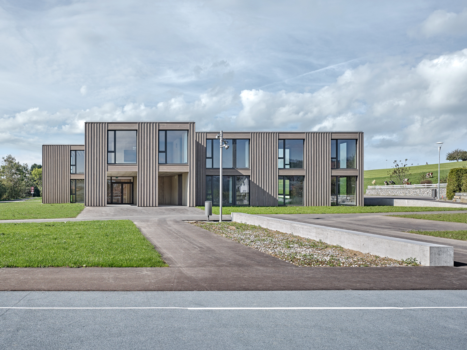 Situé à l'angle d'une zone résidentielle, en bordure de terrains agricoles, ce pavillon scolaire redessine la limite du village fribourgeois. Son implantation définit un espace public bien délimité, propice à la création d'un aménagement paysager.