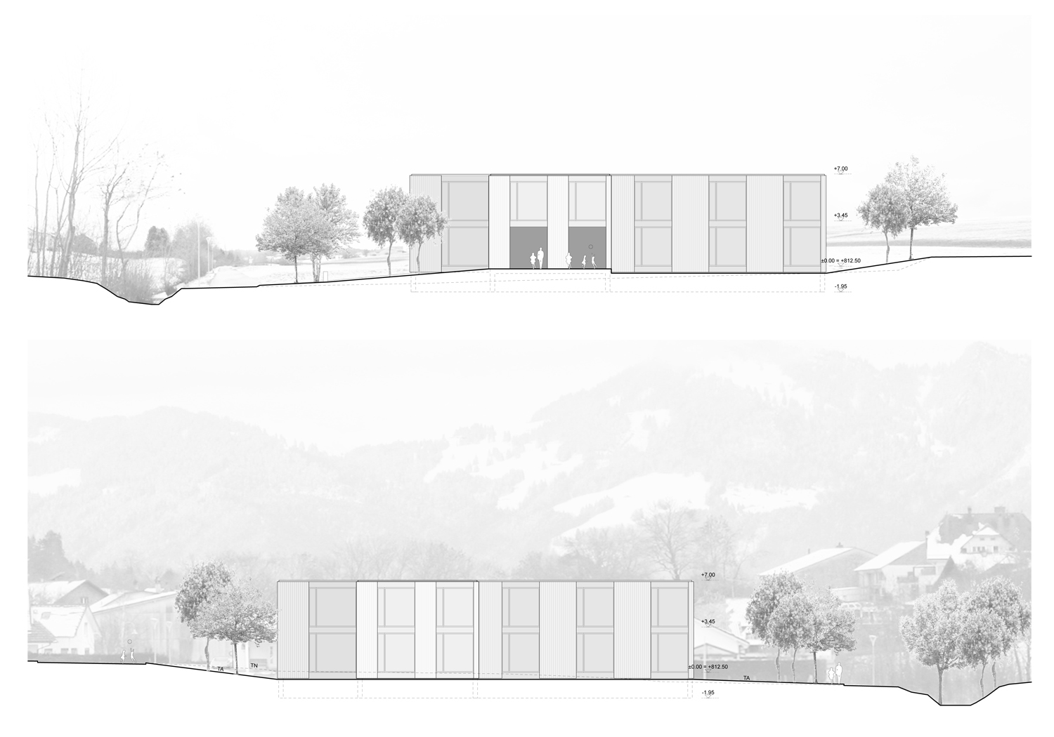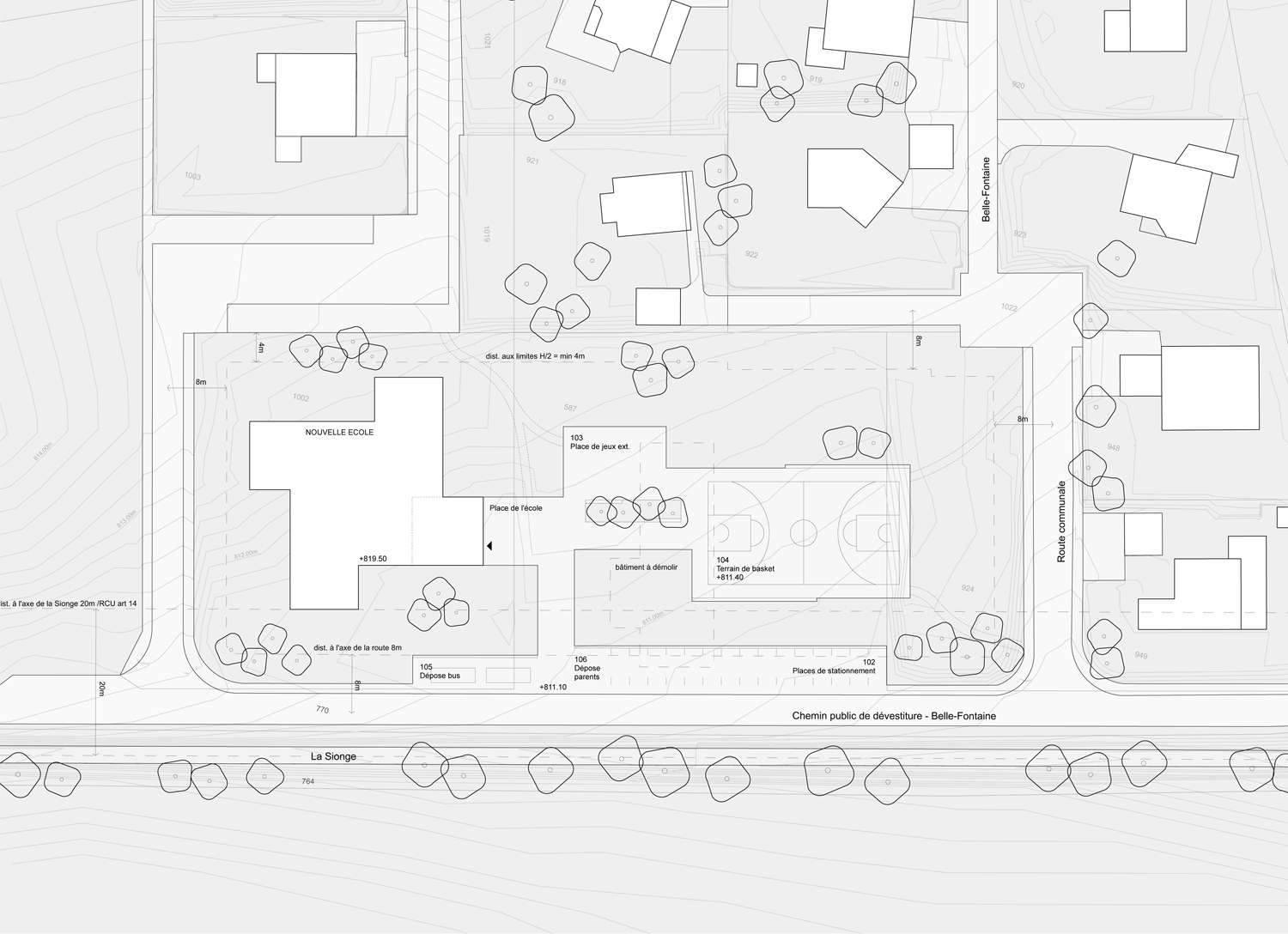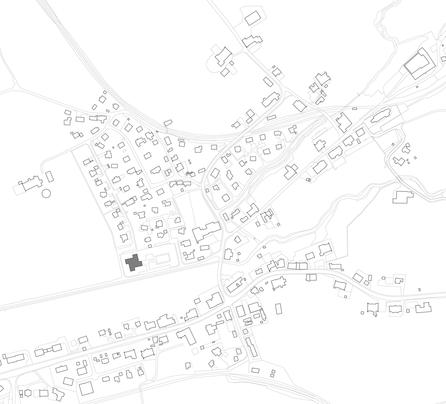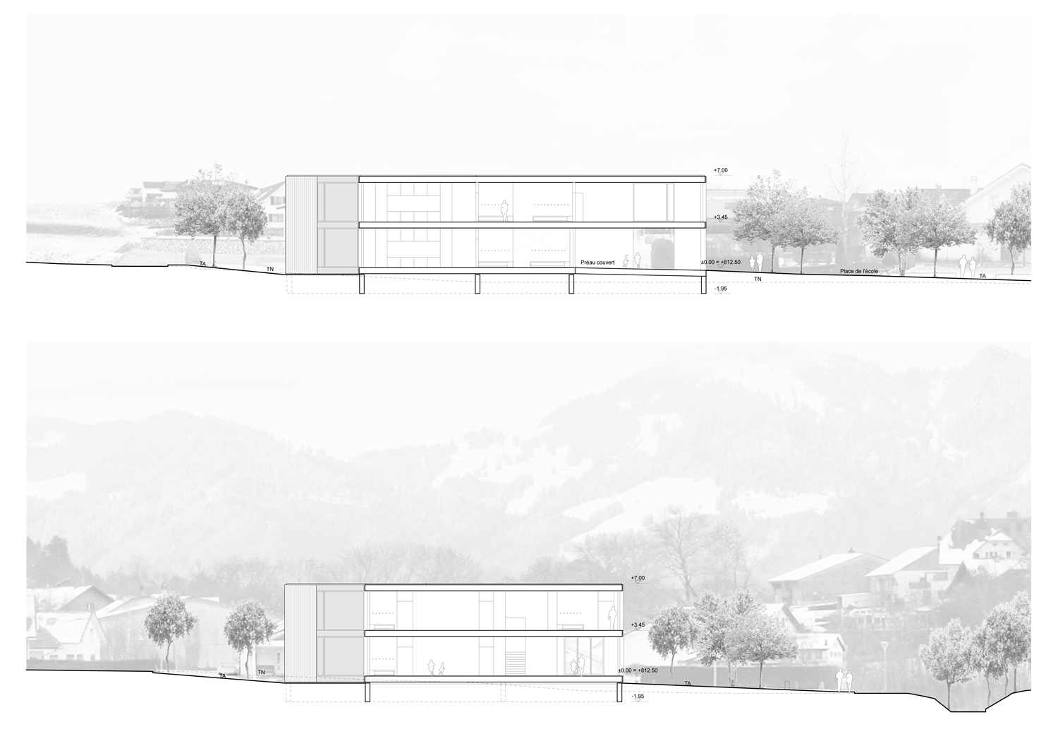 Situé à l'angle d'une zone résidentielle, en bordure de terrains agricoles, ce pavillon scolaire redessine la limite du village fribourgeois. Son implantation définit un espace public bien délimité, propice à la création d'un aménagement paysager.