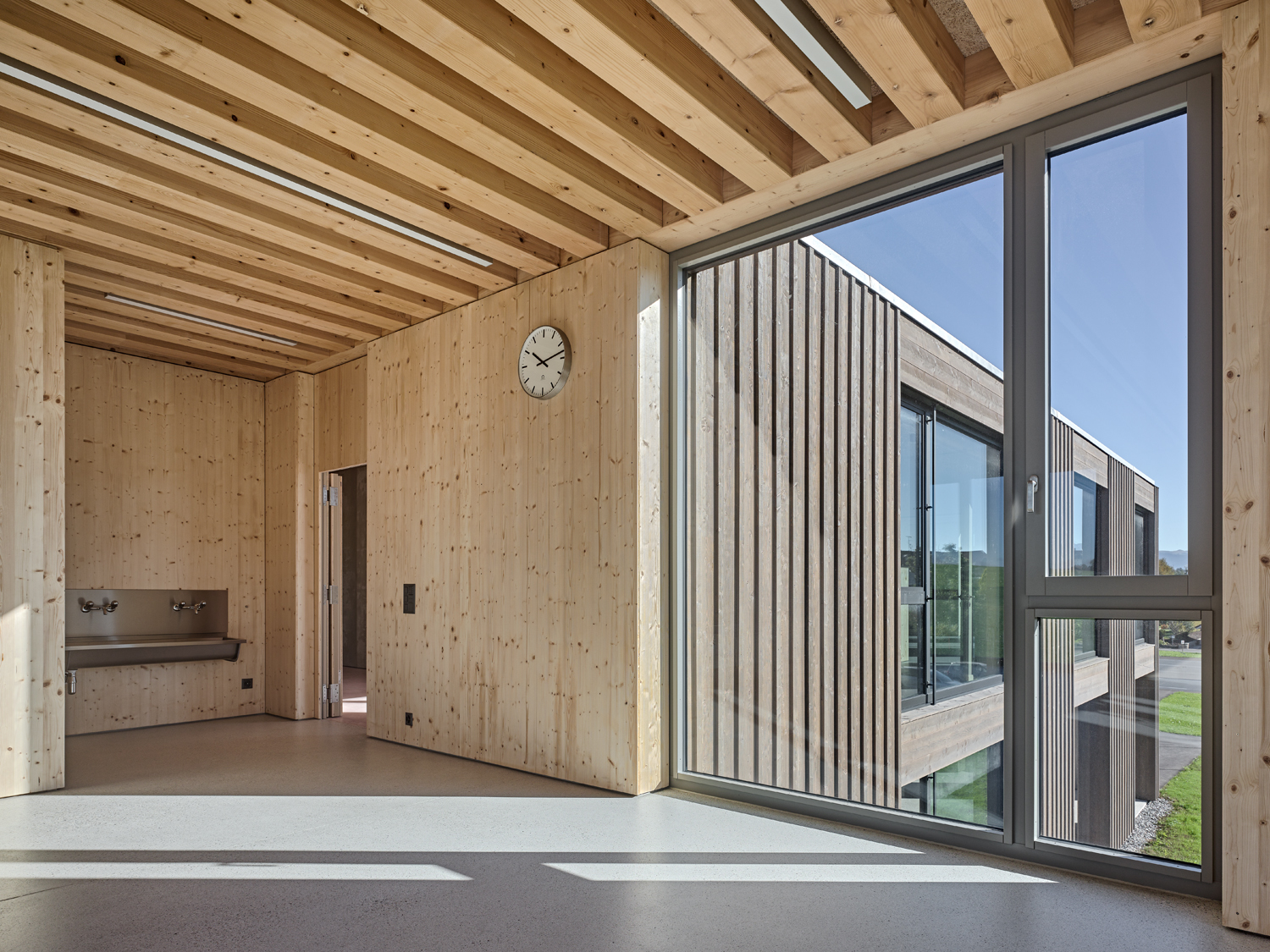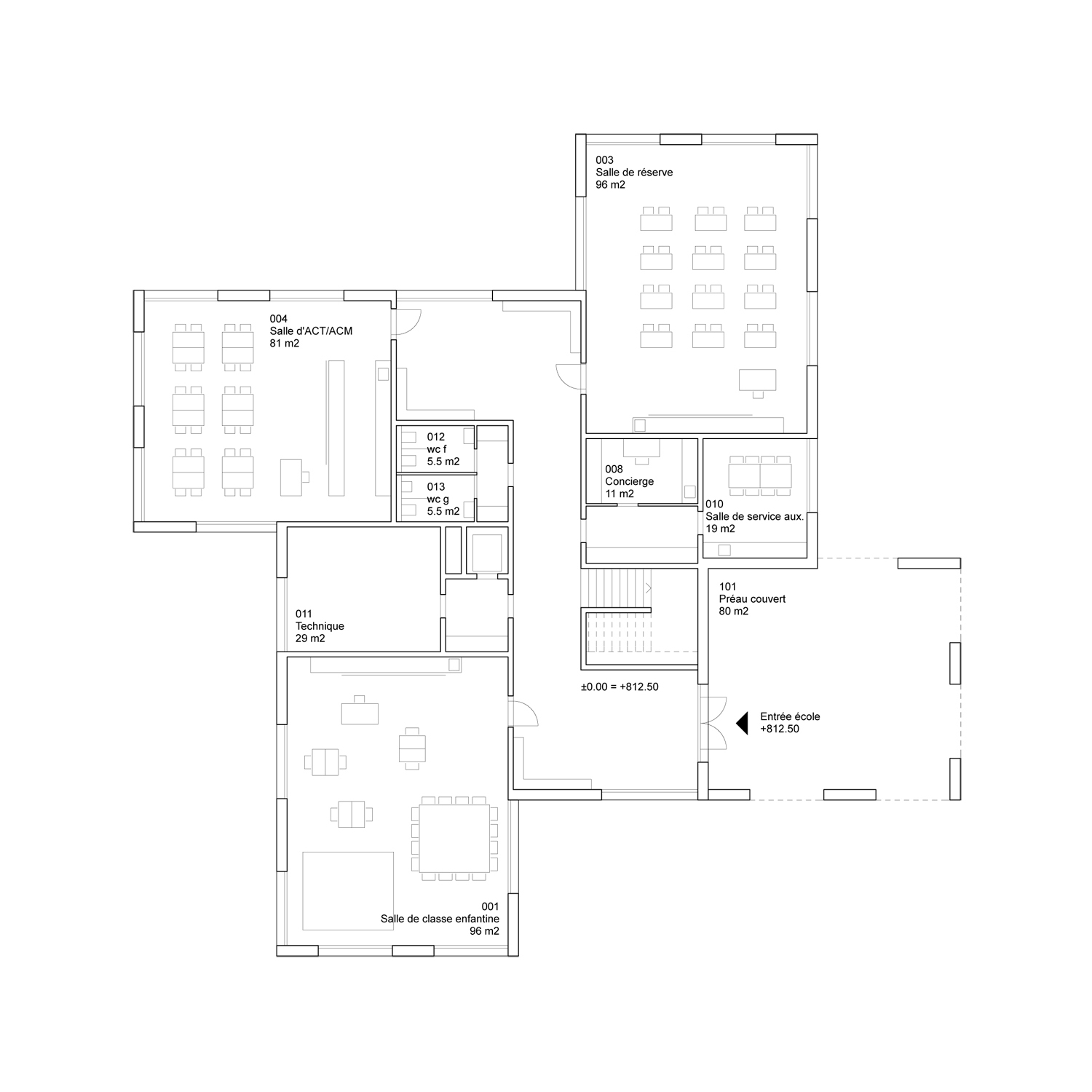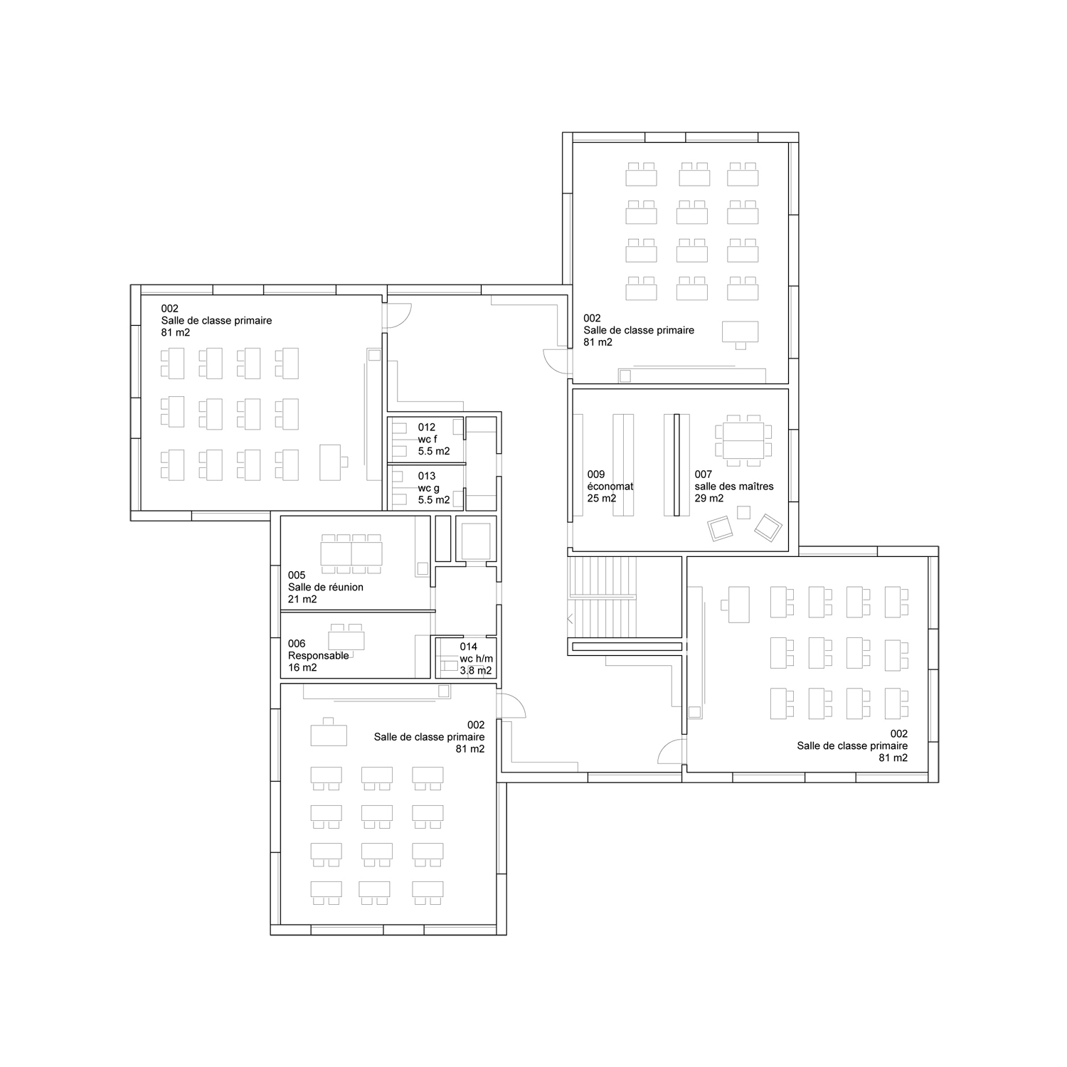 Le volume du bâtiment comprend deux niveaux sans sous-sol. Les salles de classes sont disposées aux deux bouts d'un couloir central en forme de "S" qui inclut la cage d'escalier et les sanitaires. Les deux extrémités de cette distribution s'élargissent afin de créer un espace, à la fois vestiaire et sas d'entrée, qui donne accès à deux classes. Ouverte sur trois côtés, chaque classe offre un panorama différent selon sa situation.