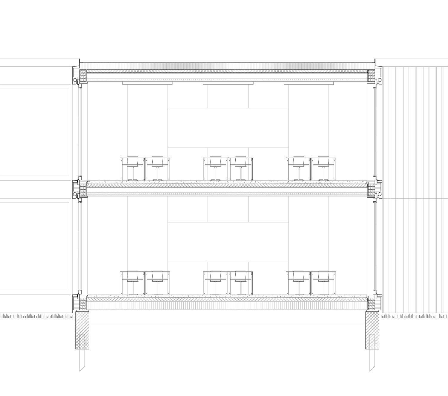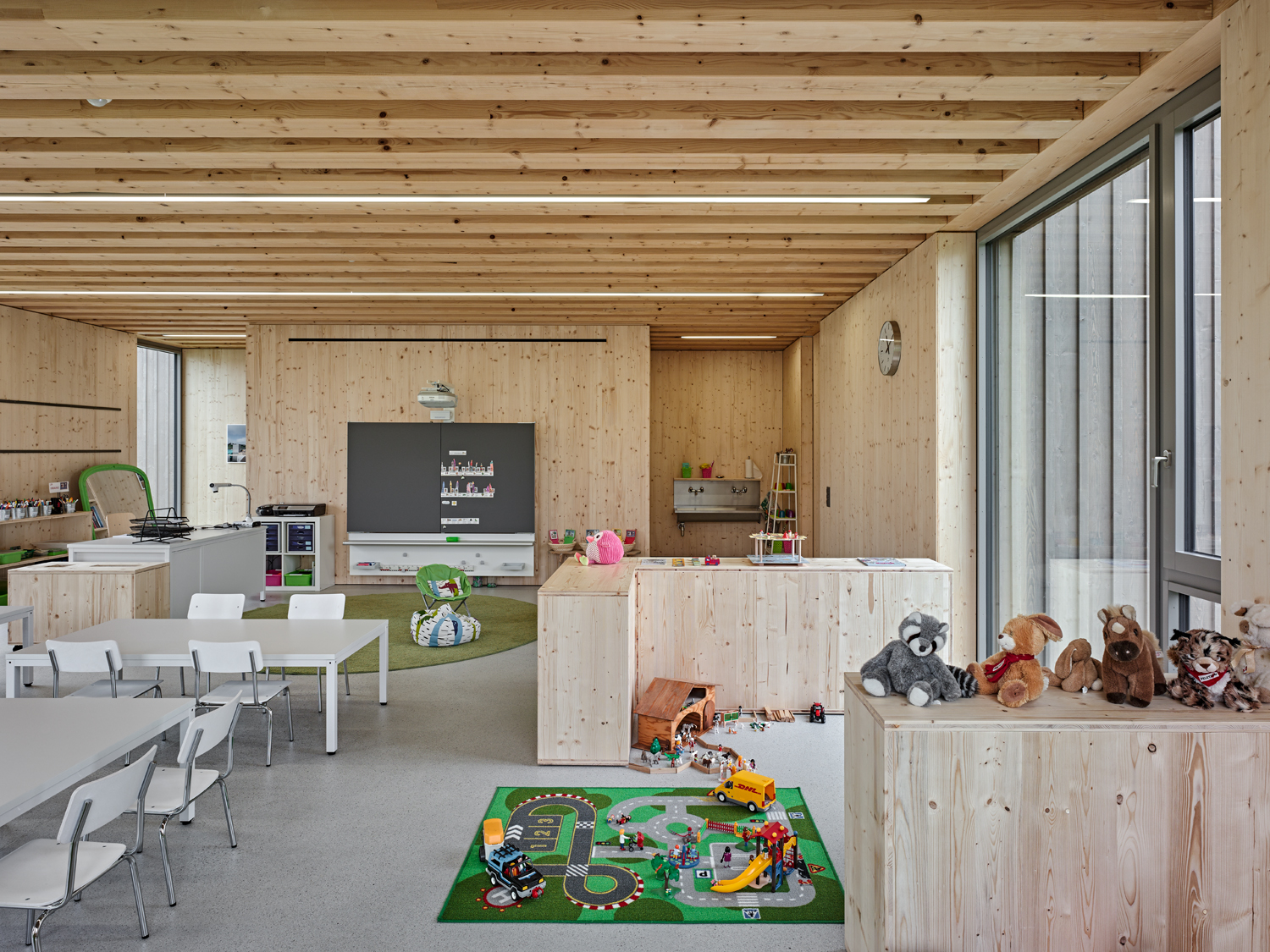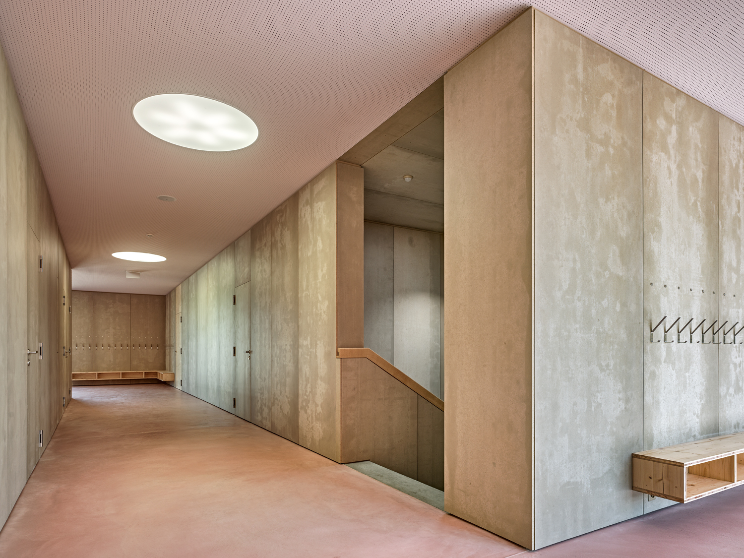 Le volume du bâtiment comprend deux niveaux sans sous-sol. Les salles de classes sont disposées aux deux bouts d'un couloir central en forme de "S" qui inclut la cage d'escalier et les sanitaires. Les deux extrémités de cette distribution s'élargissent afin de créer un espace, à la fois vestiaire et sas d'entrée, qui donne accès à deux classes. Ouverte sur trois côtés, chaque classe offre un panorama différent selon sa situation.